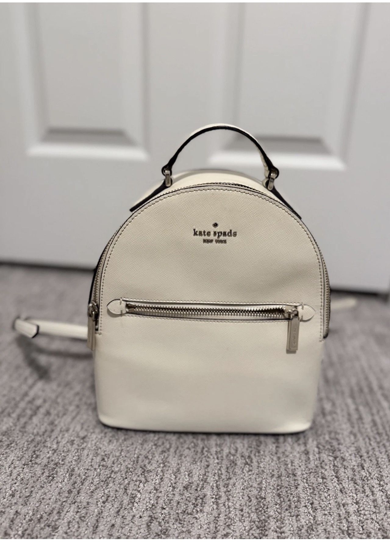 Kate Spade Women's Saffiano Leather Perry Cream Small Backpack, gently used, you can see the condition at the video, very clean inside as I used to have only my wallet and sunglasses inside, never food or drink.