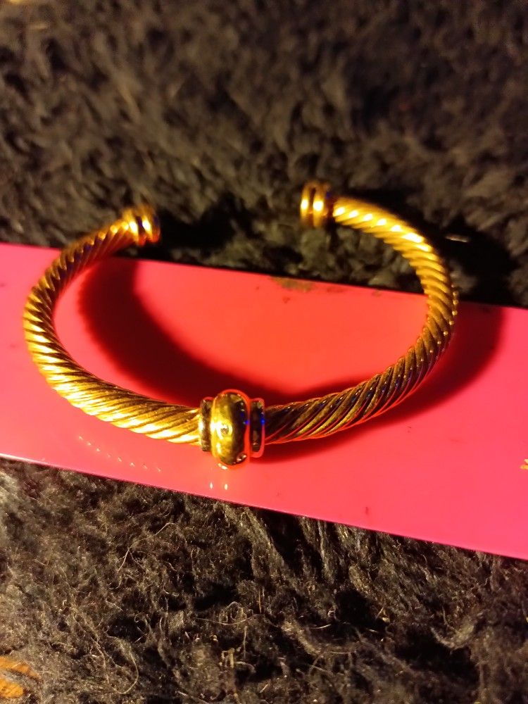 This is a very pretty gold tone twisted metal rope design bracelet. It has two gold caps on each end and around metal ball in the Middle with little white rhinestones in it. It is open cuff bracelet it fit 2.5 in wrist. Please refer to pictures for further details. Must be able to pick up in Lakewood. Thank you.