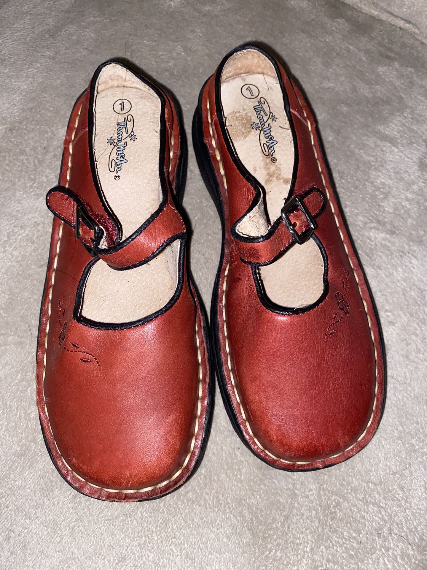 Girls Thom Mcan Slip On Shows - genuine leather .. size 1 .. dark brown in color .. have a velcro strap .. cute little engraved flower design .. great for the holidays, dressing up or just w a pair of jeans .. very comfortable due to the thick padding inside.
