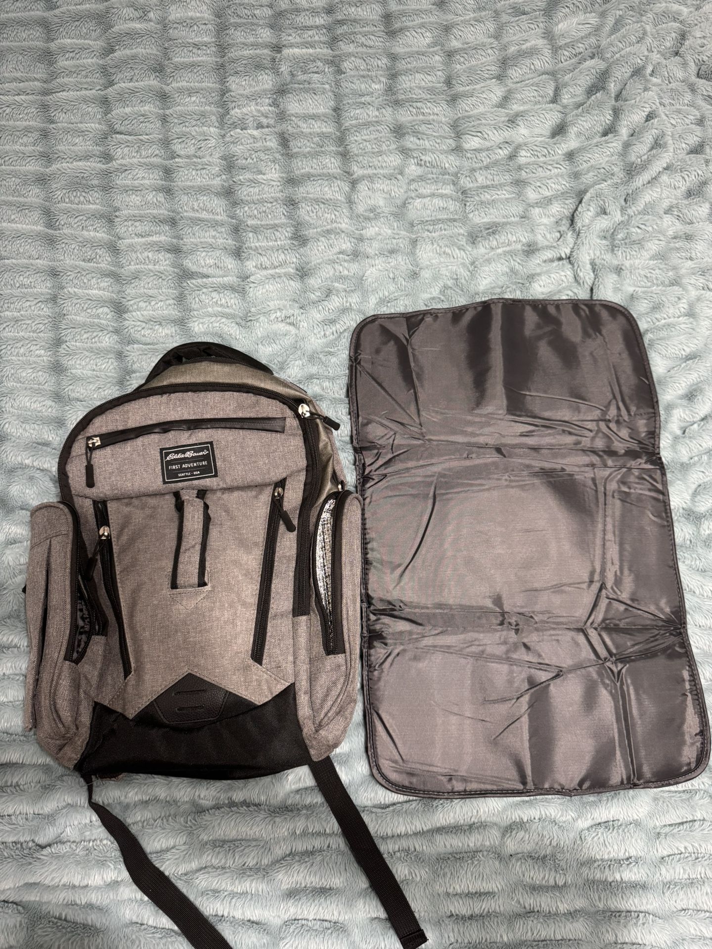 Eddie Bauer First Adventure diaper bag like-new used only a handful of times, still have the diaper changing pad. insulated bottle pocket. baby wipes storage pocket. adjustable shoulder straps. pick-up Brighton Park or McKinley Park area.