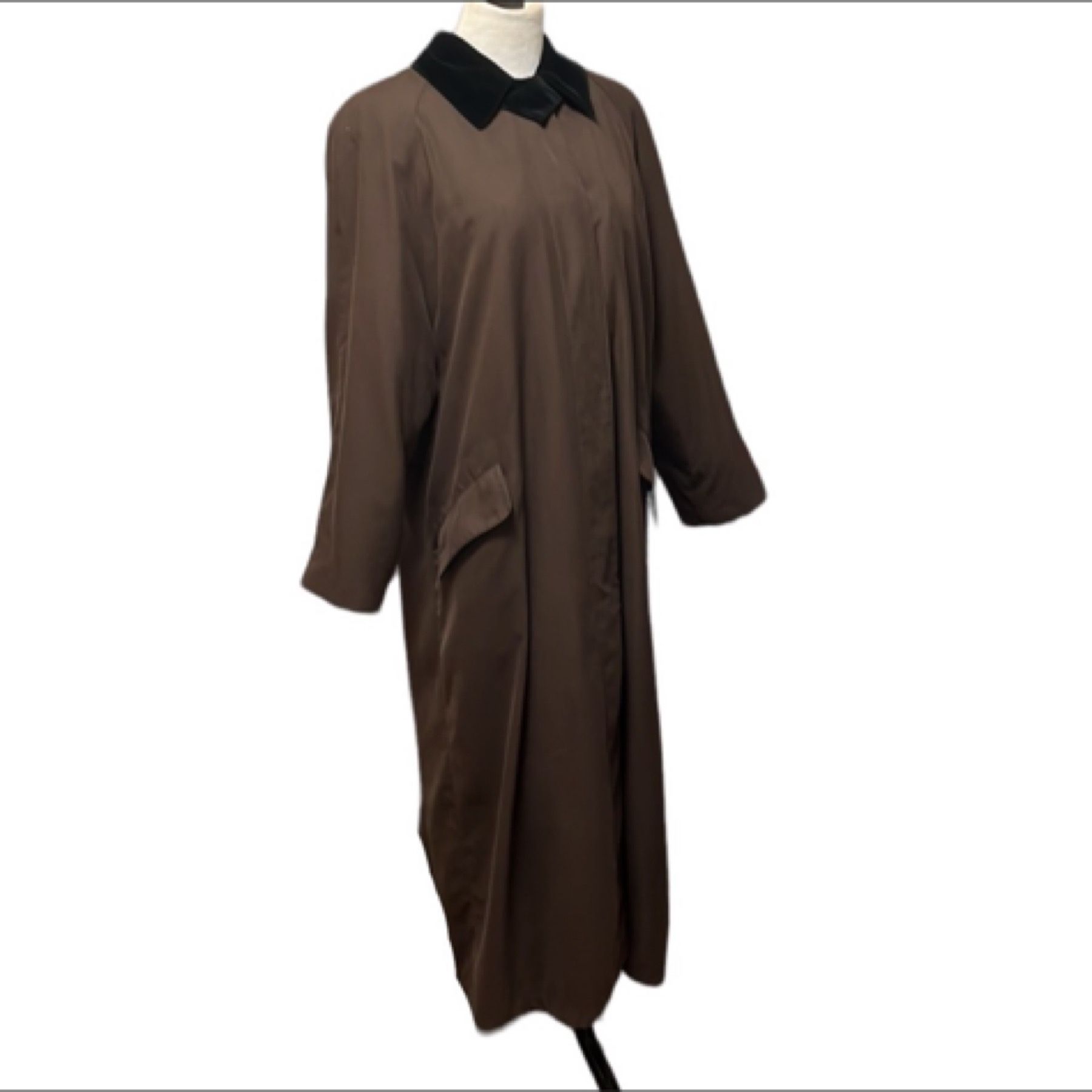 Brownish green (olive maybe lol)(?) super soft full length dress coat. The buttons are green & depending on lightening it looks brown or dark olive greenish ✔️shoulder pads ✔️removable lining ✔️sleeves have inside button to hold lining in place ✔️5 hidden front buttons ✔️velvet collar & inside pocket flaps ✔️2 front pockets ✔️slit in back ✔️removable velvet v to hide top velvet button & hold closed ✔️buttoned cuffs ✔️dry clean only P2P 23” Sleeve 29” Length 51”