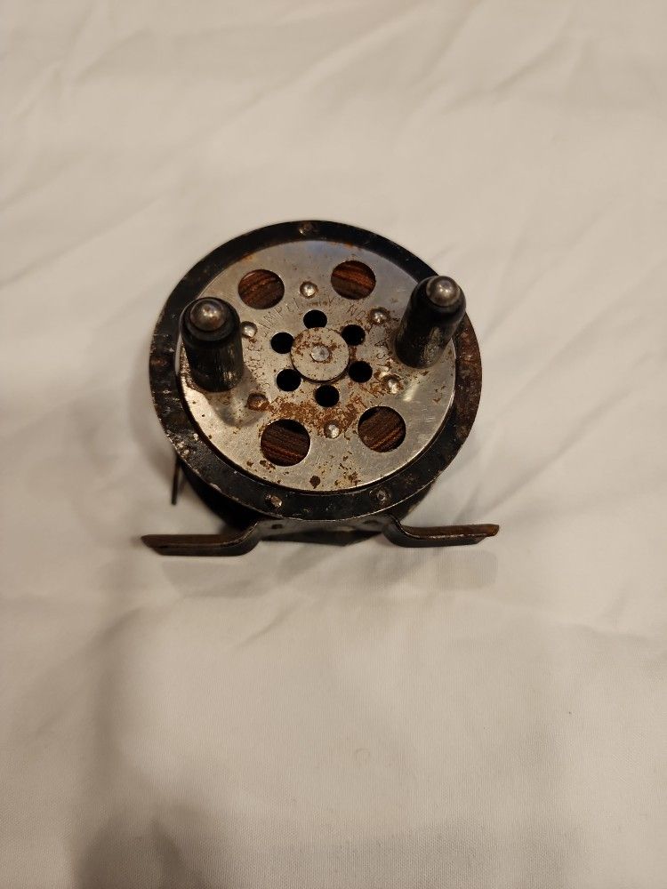 Gail Simplicity fly reel #5. It is old and still has smooth cranking to it. It has original fly line that's brown in cooler. Has two wooden knobs for winding. An excellent piece for collecting.
