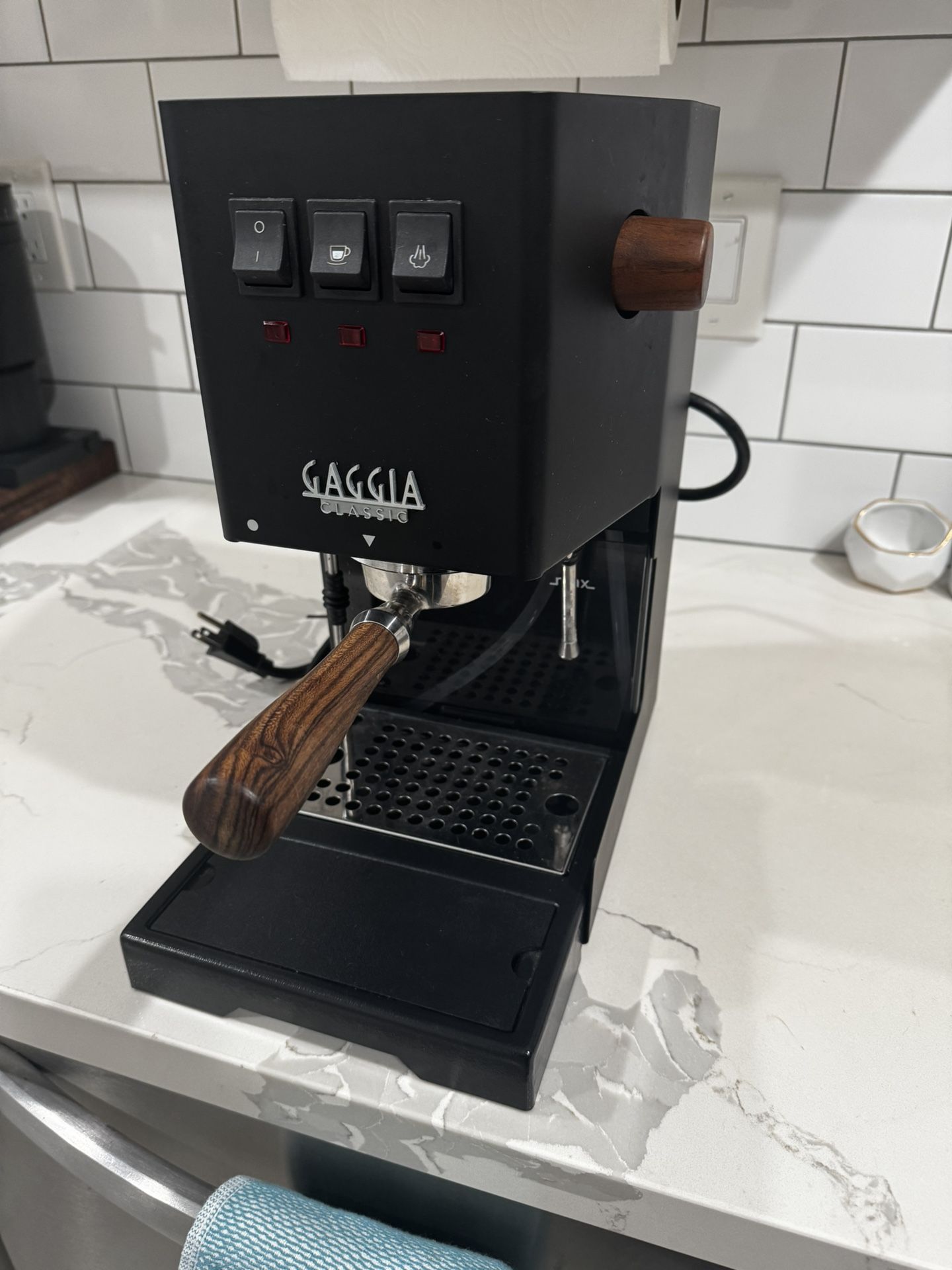 Gaggia Classic Pro in excellent condition. Works just as good as the day I got it. Upgrades: - Walnut steam control knob - 9 Bar pressure spring - Larger and shorter drip tray with storage. (room for scale) - Walnut handled portafilter Also includes - Original drip tray - Original portafilter - Original steam knob This one: https://offerup.com/redirect/?o=aHR0cHM6Ly93d3cuYW1hem9uLmNvbS9HYWdnaWEtUkk5MzgwLTQ5LUNsYXNzaWMtRXNwcmVzc28vZHAvQjA4Nkg0NThNUC8=