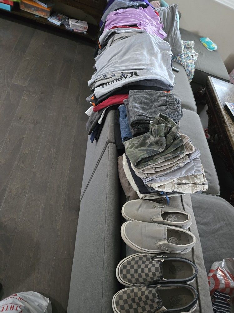 15 short sleeve 17 long sleeve 4 pants 8 shorts 2 pairs vans size 5 boys Size 10-14 a lot of brand name