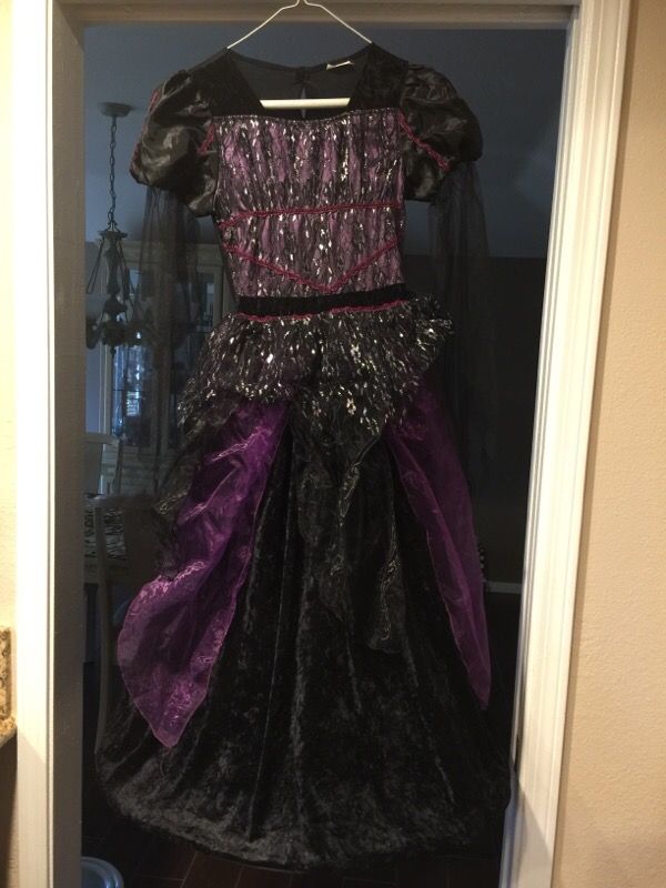 Midevil style princess gown/ or witch with built in hoop skirt. Good condition. Black with purple. Girls size large fits size 8-12. Cute