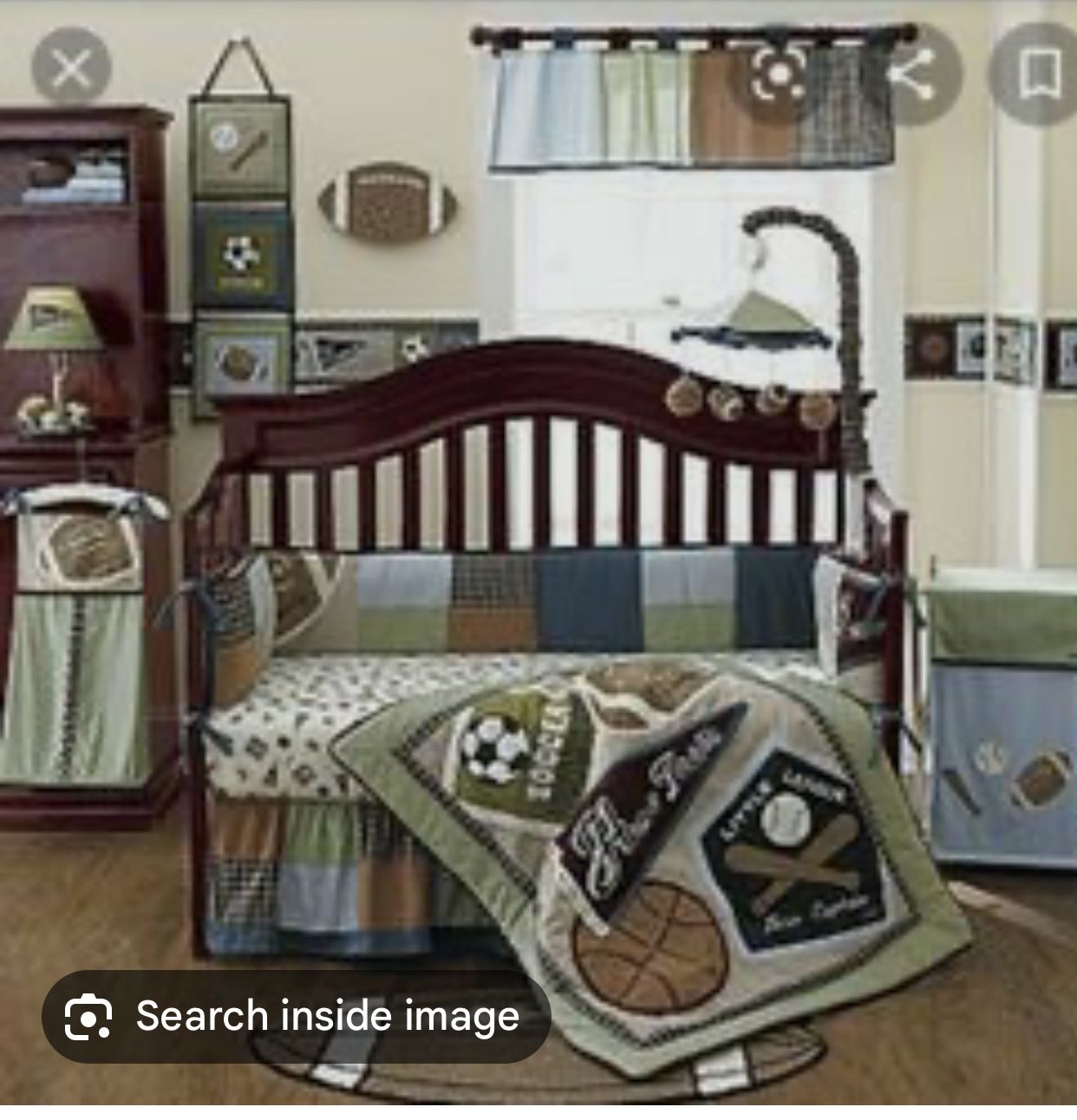 Includes: Diaper bag Fitted sheet Bumper Comforter Window valence Decorative wall hanging Light switch cover