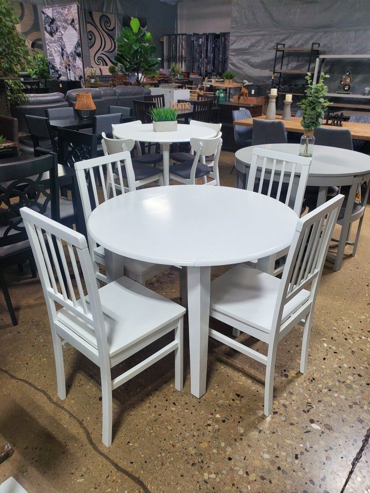 White small 5 pc Round Dining Set With Drop-Leaf on both sides with 4 sturdy white chairs