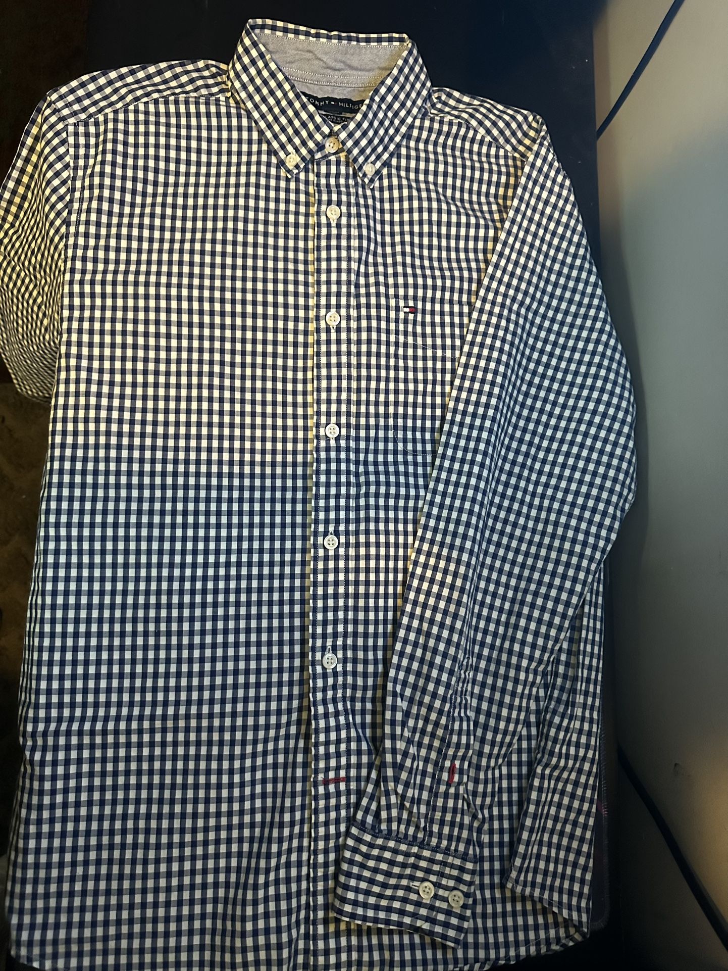 Size medium long sleeve Tommy Hilfiger blue and white shirt. Meet in Denver 👍