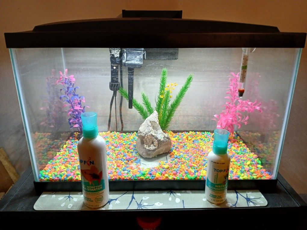 4 month old 10 gallon fish tank($50.)+ $100. of accessories. Filter, heater, thermometer, 3 decorative "plants," crystal rock, colorful rocks, 8 oz. bottle of bacteria starter, 4 oz. of water conditioner, fresh water food flakes, and a fish net.