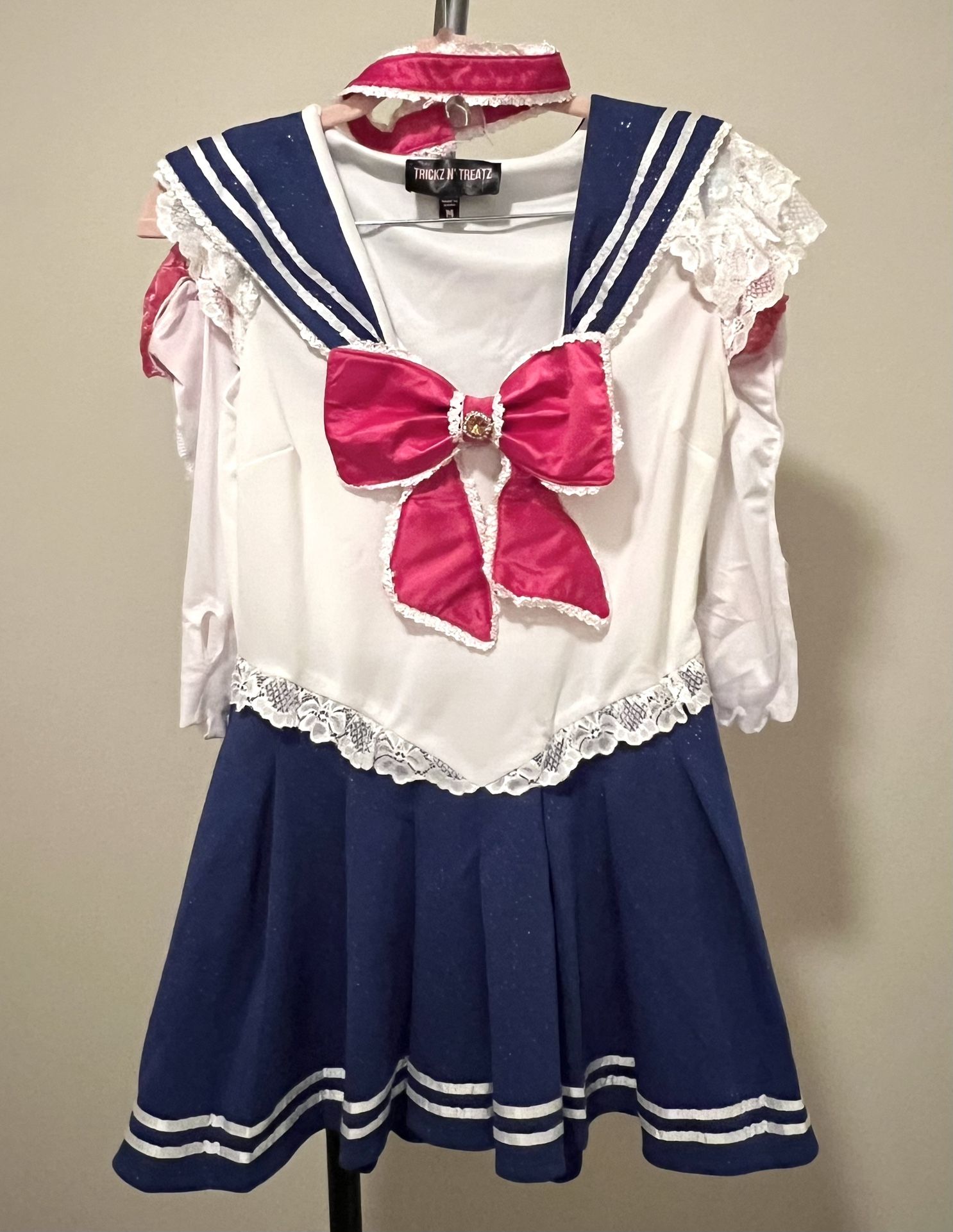 Selling a second-hand Sailor Moon costume from Dolls Kill, size M. It includes a skirt, a choker with a moon-shaped decoration, and a pair of white long gloves with magenta lace details. It's in great condition. I'm 175 cm (5'9") tall and weigh 60 kg (132 pounds), and it fits comfortably. Perfect for cosplay or Halloween! Feel free to message me if you have any questions.