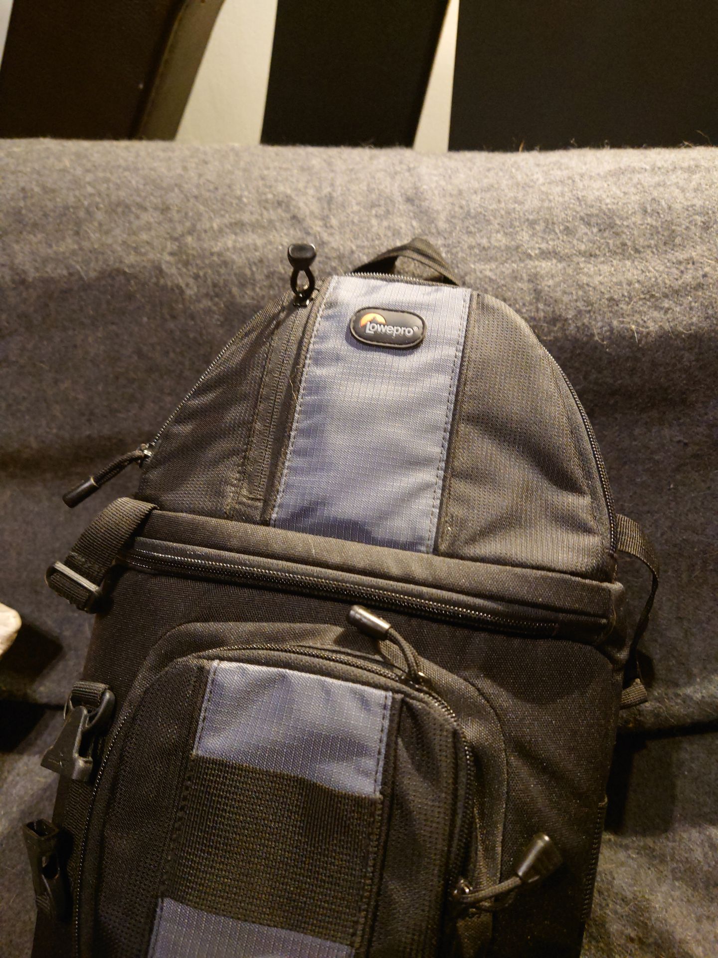 Barely used, like new. Top compartment fits DSLR body. Middle compartment has velcro dividers and a cleaning cloth attached. SD card storage, and accessory front pouch. Nice!