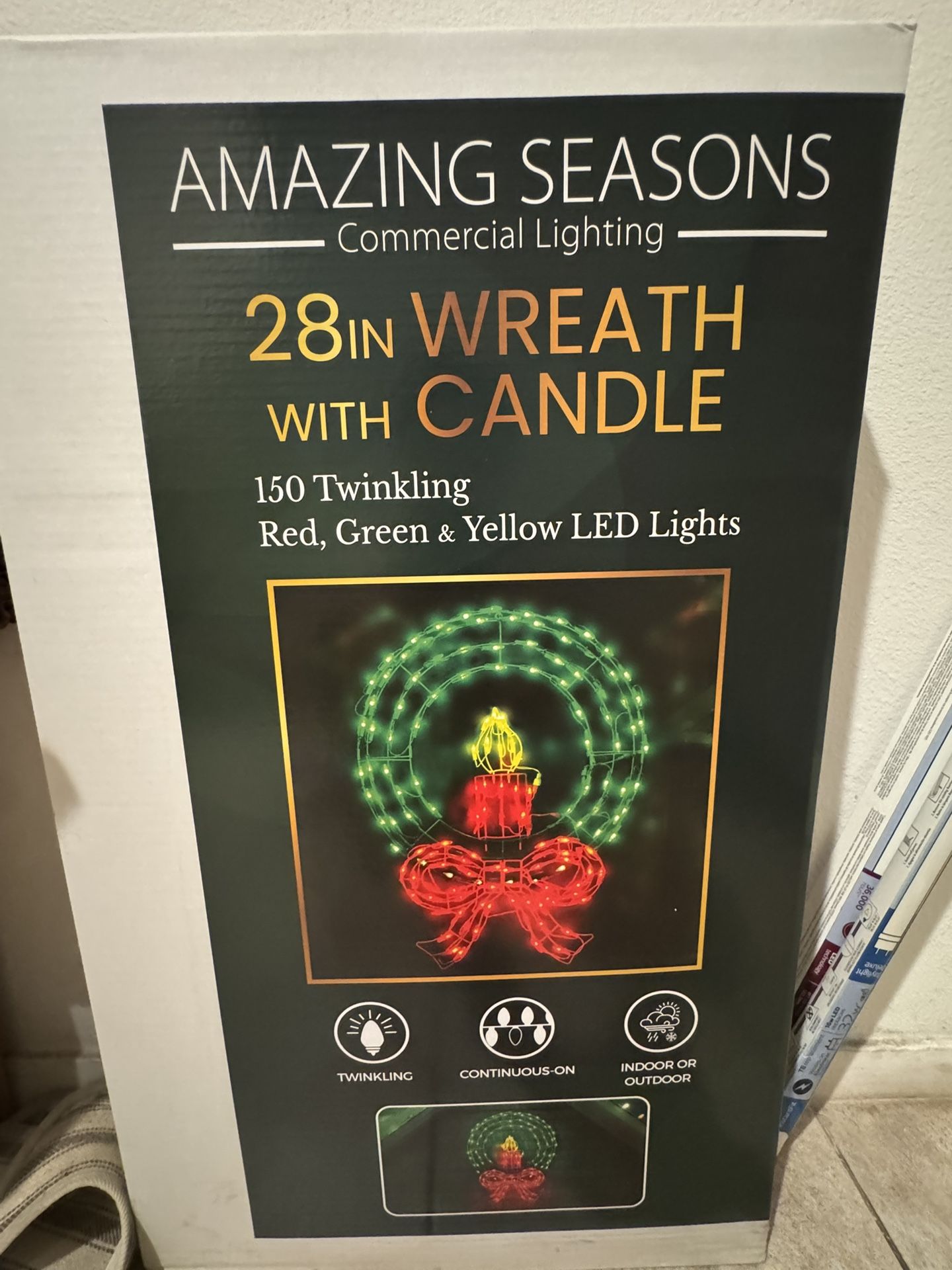 28in Pre-lit Christmas Wreath with Candle & Bow, 150 Green & Red & Yellow Twinkling LED Lights