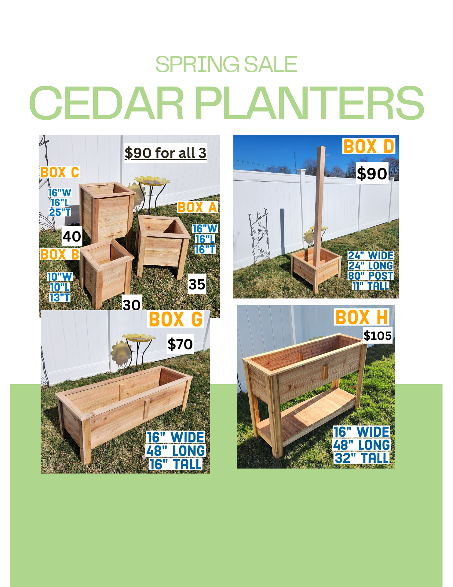 Cedar lumber for insect and weather resistance. Glued and nailed joints Holes drilled for proper drainage A= $35 B=$30 C=40 ABC Combo = $90 total! D=$90 E=$75 G=$70 H=$110 J=$110 4x8 corrugated steel garden beds =$250 Delivery available. Discounts on multiples.