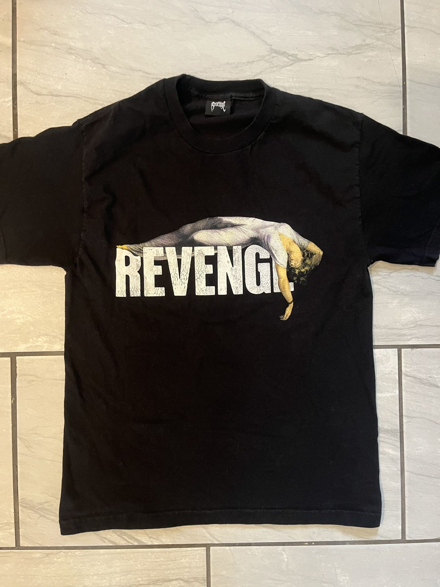 Revenge streetwear graphic t shirt size medium. Like new, great condition. Measurements: 19” x 27”. The Revenge Nightmare Inspired Streetwear Graphic T-Shirt in size medium is a limited edition piece perfect for men who appreciate designer hip-hop fashion. The black shirt features a logo accent and a regular fit, making it versatile for all seasons. Made in the United States, this short sleeve tee is a must-have for fans of the Revenge brand, offering a unique and eye-catching addition to any wardrobe.