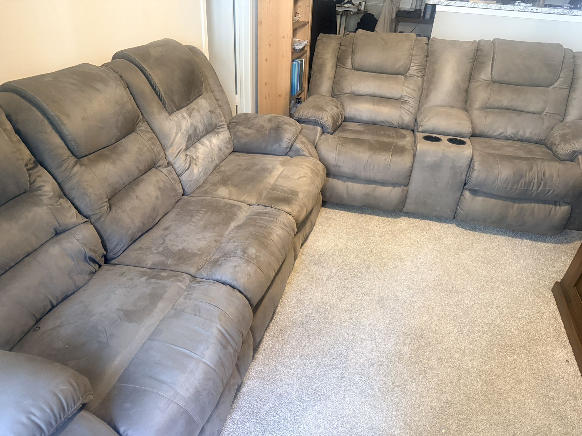 Comfortable Sheridan II reclining sofa and loveseat set in great condition. Perfect for a living room, basement, or entertainment space. ✔ Dual reclining sofa ✔ Loveseat with center console & cup holders ✔ Soft microfiber upholstery ✔ Very comfortable and spacious ✔ Neutral color that matches most décor This set is clean, sturdy, and ready for a new home. Smoke & Pet Free Home. 💲 Price: $600 for the set 📍 Pickup only – must bring help to load Message if interested! Forms of Payment: CashApp/Zelle/Cash