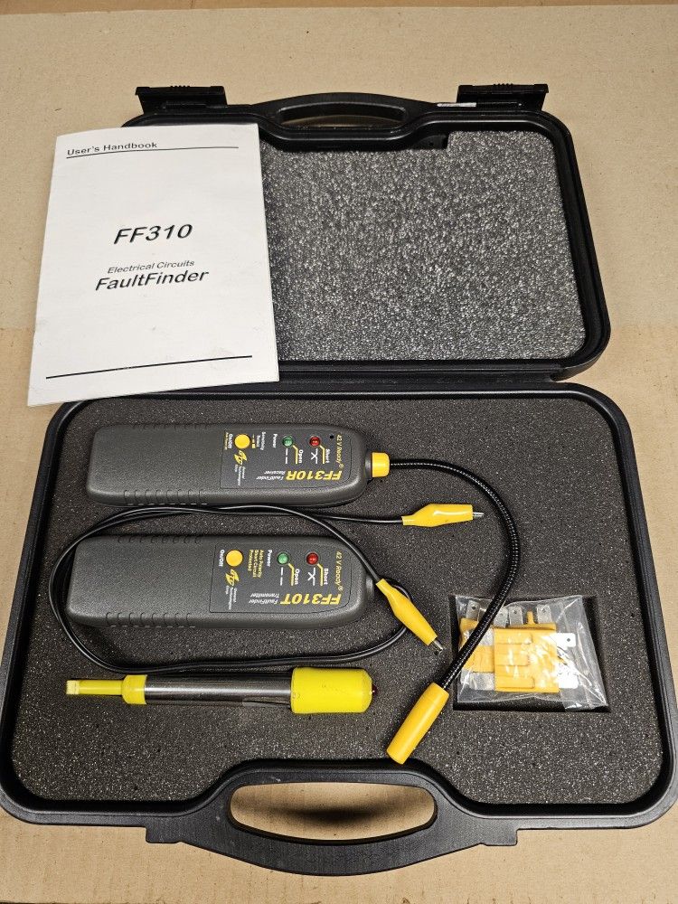 General Technologies FF310 electrical circuit short/open fault finder. Contains 1 transmitter and 1 receiver. Locate short circuits, open connections, broken wires, current leaks and even trace wires. - 42 V Ready: for use in the new generation of vehicles with mixed or single 42 volt systems. - Operates on DC voltages from 6 to 42 volts. - Internally protected against power surges and overloads. - 8 inch flexible probe allows reaching wires in congested places. - Transmitter and receiver LED's show open or short circuit conditions. - Variable audio/visual signal provides fast and intuitive feedback on the circuit/wire proximity. - Adjustable sensitivity for all tracing situation. - No wire piercing required, non-contact technology. - Tracing of wires is made possible even inside bundles, conduits, behing panels, under carpets, upholstery, etc. - Transmitter has auto polarity and leads with 5 amps alligator clips. - For use in: automobiles, trucks, trailers, boats, RV's and any 6 to 42 volt DC powered circuits. Brand new, never used.