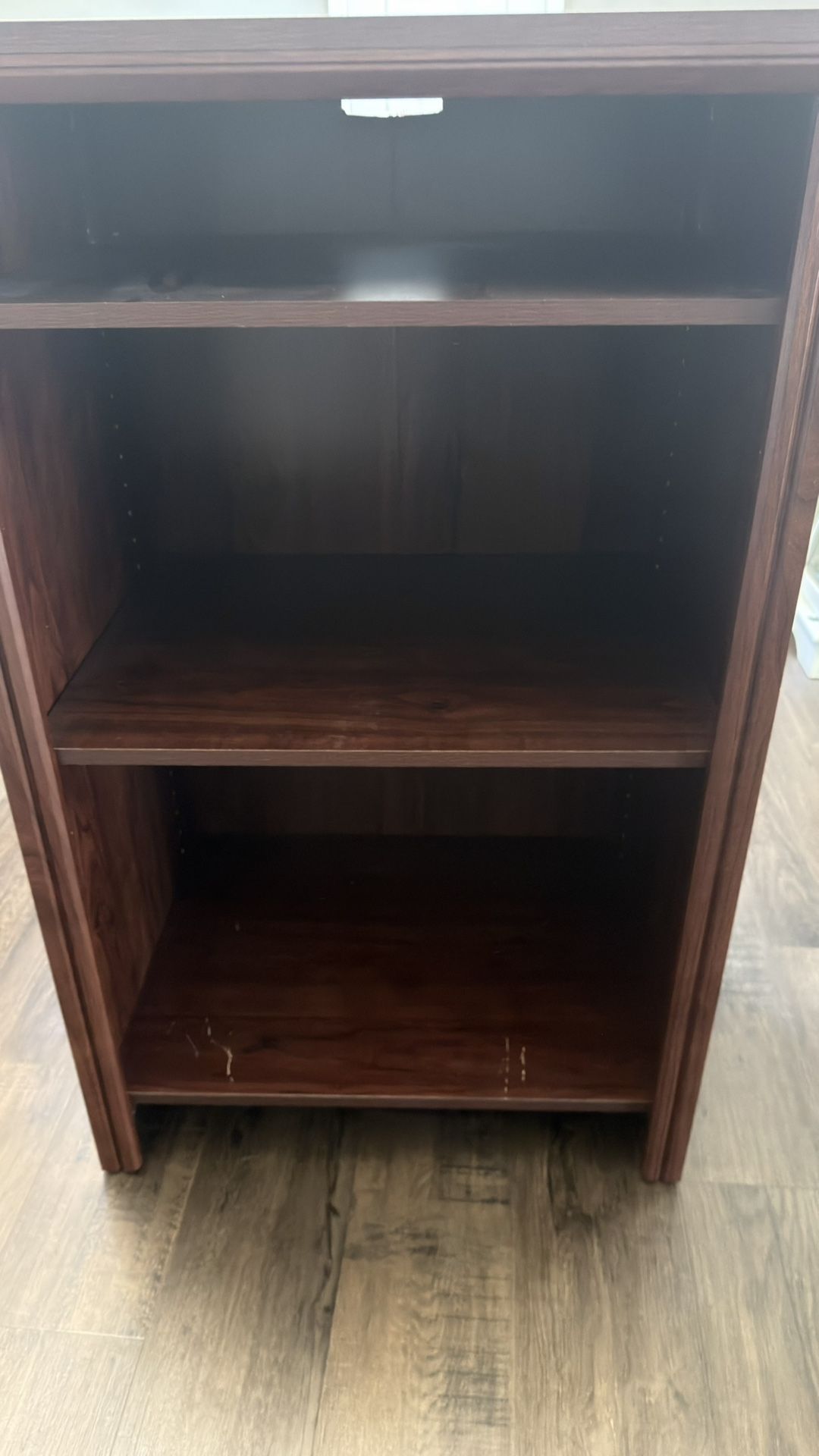 This 3 shelf unit is wide and with adjustable shelf heights. See below for exterior dimensions. Other than scratches on the bottom shelf (shown in photos) the unit is in great shape. Exterior Dimensions: 25.25” wide x 19.75” deep x 41.5 inches tall.