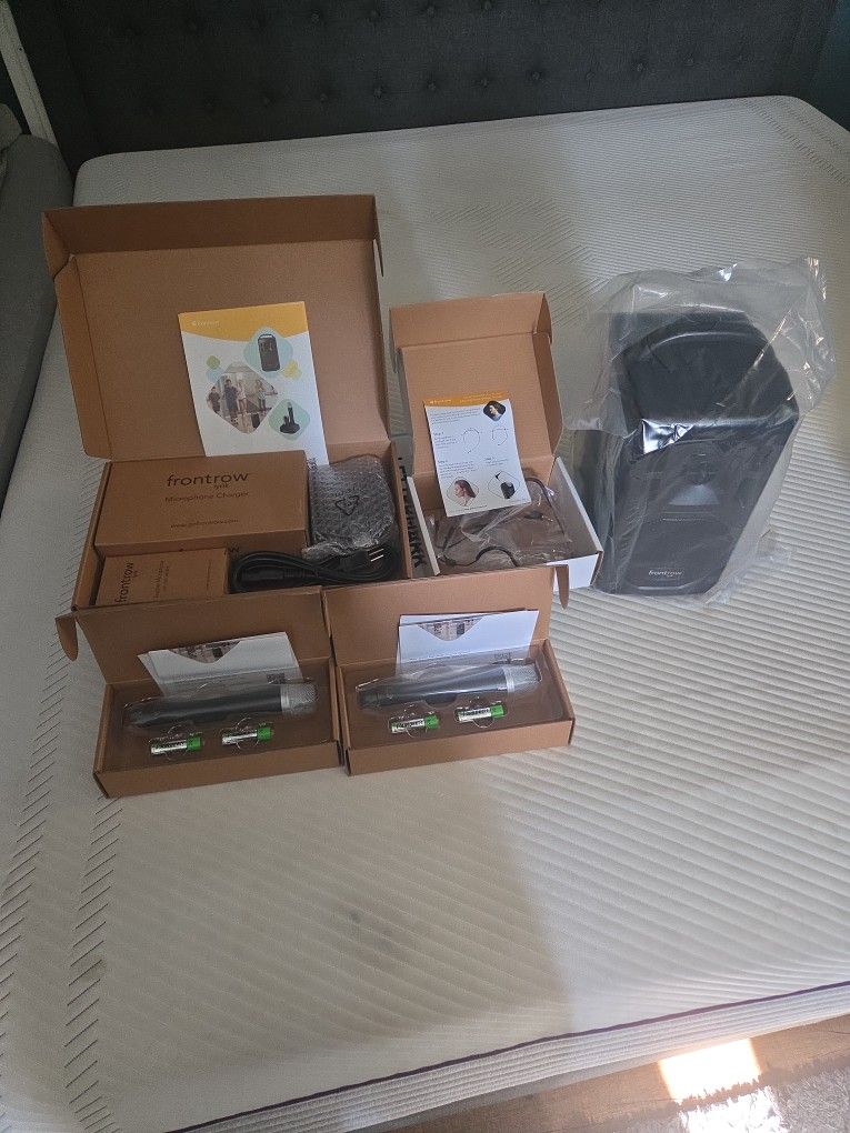 All brand new! Never used! 1-Frontrow lyrik speaker 2- Microphones 1- Microphone Charger 1- Teacher Microphone 1- behind the neck Microphone 1-speaker cover