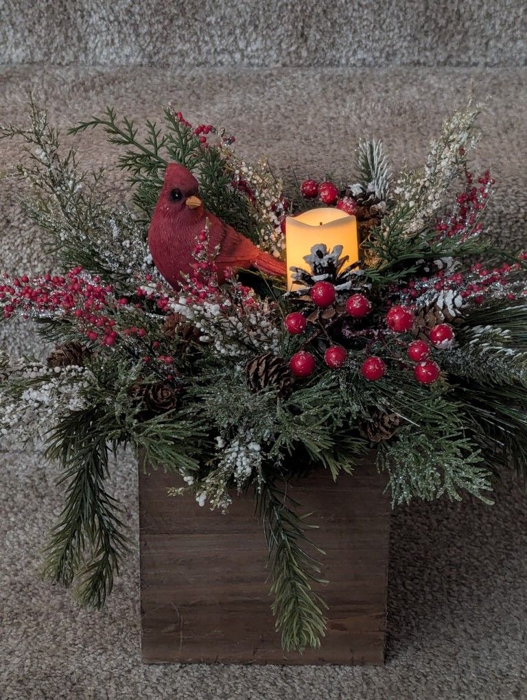 2 new, handmade winter floral centerpieces, each with a red cardinal atop winter pine branches and berries. These would be perfect "after Christmas" decorations to last throughout the winter months. $25 each or $45 for the pair. The wooden bases are 5" x 5 ". Candles are not glued in but are included in the price. Pickup in Hendersonville.
