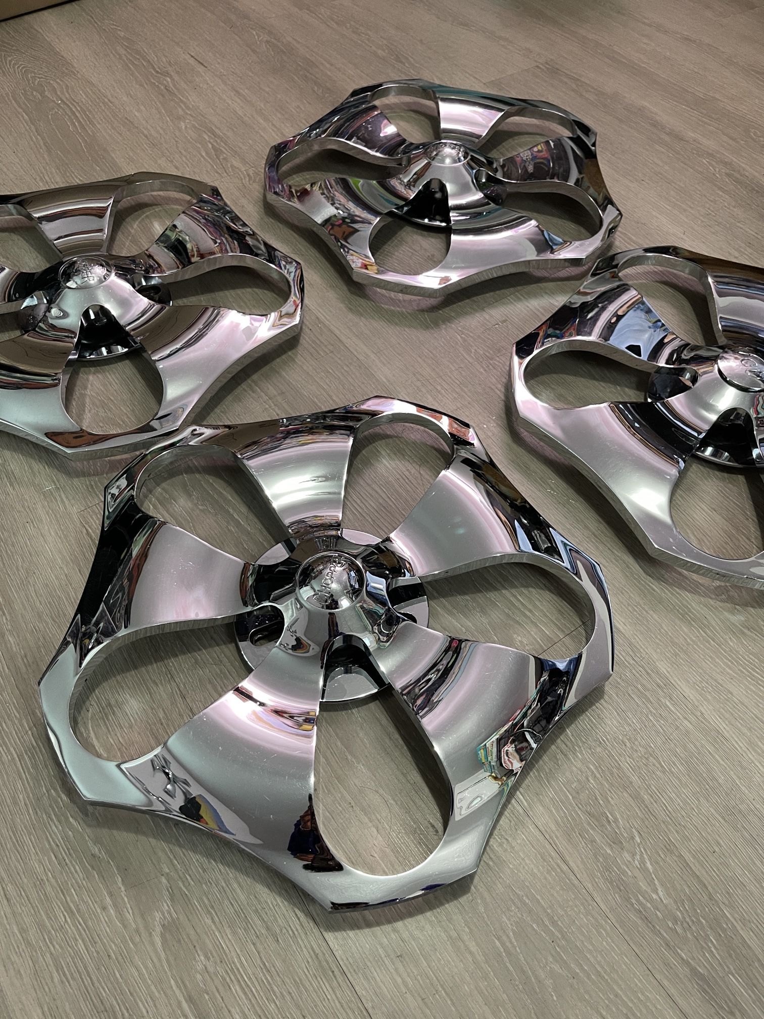 Selling a full set of 20” Chopper Spinners Condition - Used (Scuffs and scratches from storage, ONE DIFFERENT CENTER CAP Size - 20” (5 Lug ONLY) Asking $700 OBO FEEL FREE TO MESSAGE FOR MORE DETAILS AND OFFERS !