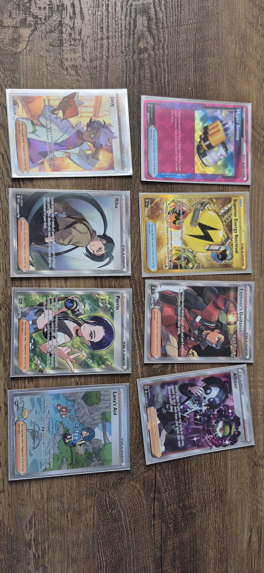 Selling as one complete lot – strong mix of Scarlet & Violet era hits. ⭐ Special Illustration Rare: Lana’s Aid (219/167 SIR) ⭐ Gold / Secret Rare: Superior Energy Retrieval (Gold) ⭐ Full Art / Ultra Rare Trainers: Perrin Rika Jacq Explorer’s Guidance Hyper Aroma (ACE SPEC) Alister All cards are in Near Mint condition and stored in sleeves. 🎁 Bonus: 5 Pokémon TCG Live codes included for FREE. Great for: Collectors Competitive players Resellers Selling as one lot only. No trades.