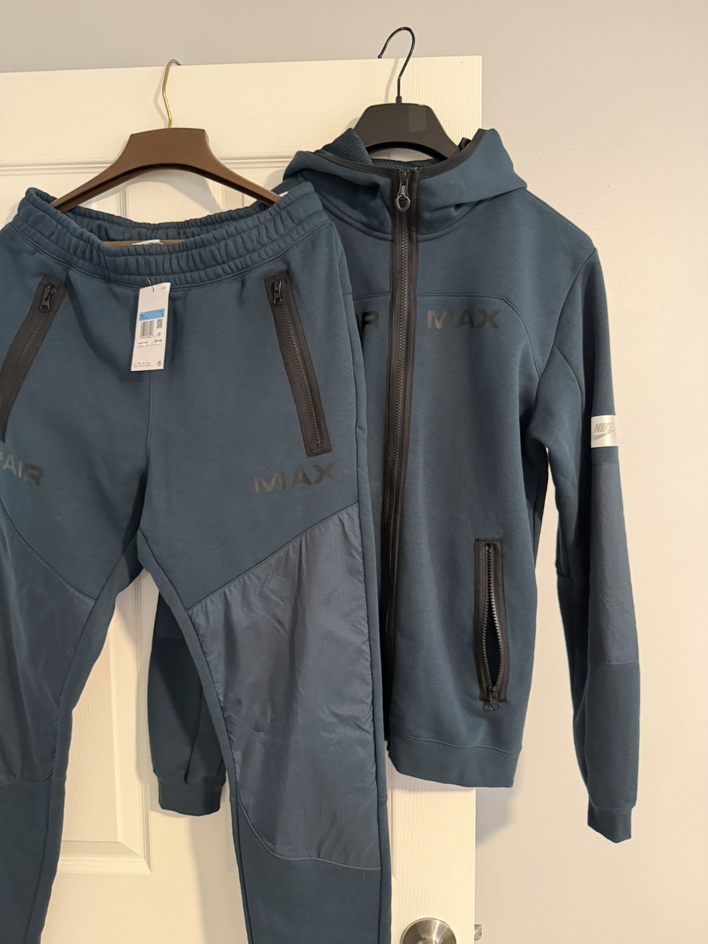 Hi Selling a Nike Air Max hoodie that has the matching Nike Air Max pants. The Hoodie is Small but fits like a Smedium (in between small and medium) and the pants is a Medium but fits like a Smedium. Hoodie and pants are both brand new $90