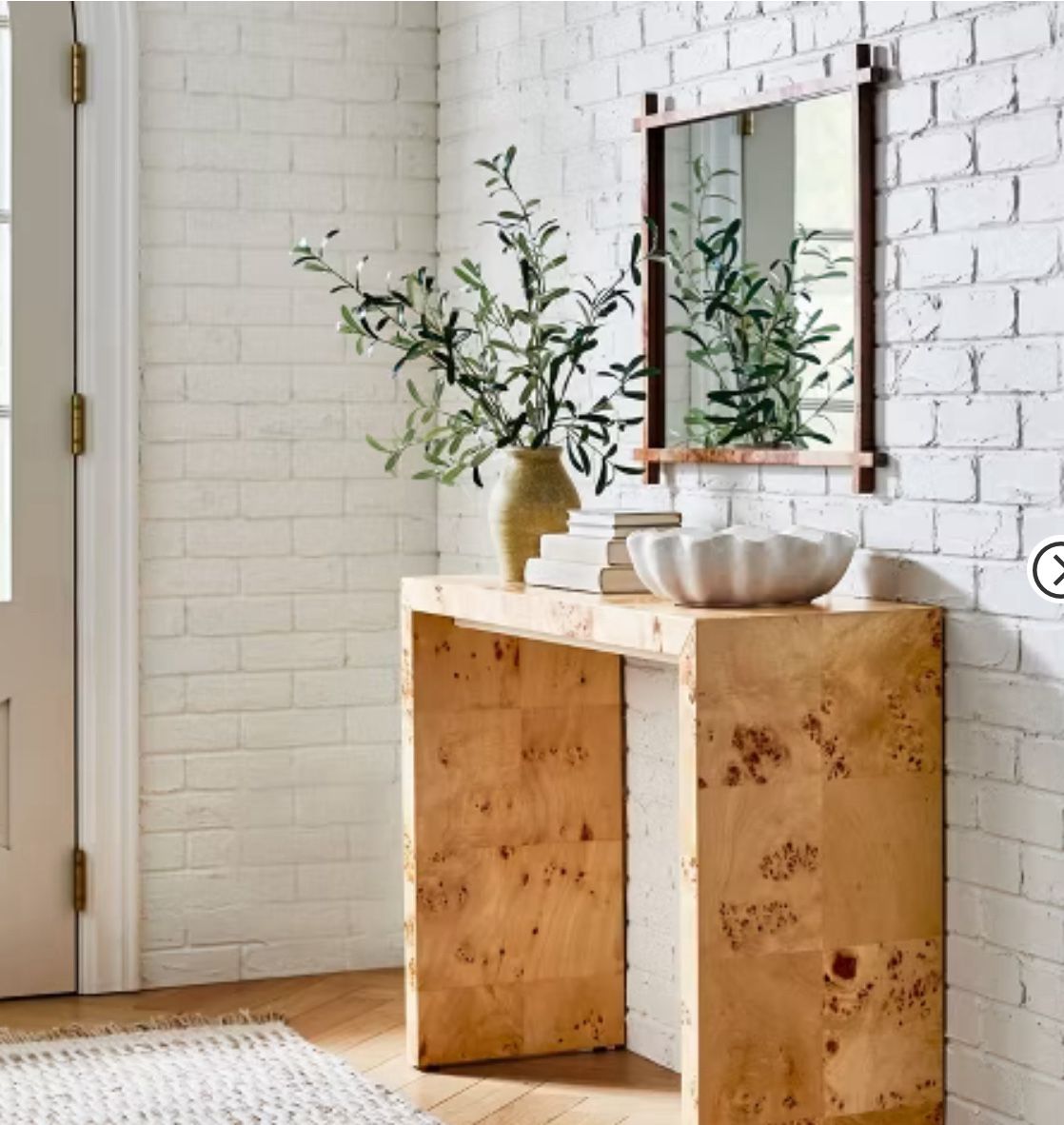 Console table adds functional style to your home Rectangle table fits along the wall Made with burled wood for visual appeal Forest Stewardship Counci