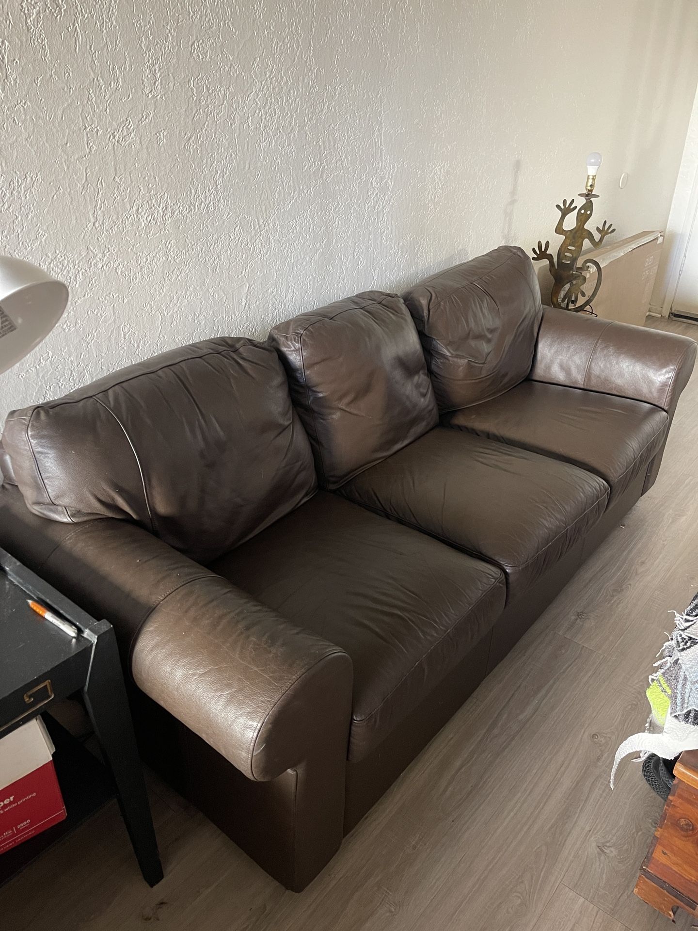Dark brown leather couch, normal wear. Comfortable, stain and tear free. I am posting this on behalf of my elderly neighbor who is moving out soon. Must be gone by end of the week! Couch dimensions LENGTH: 36 inches (3ft) WIDTH: 85 inches (7ft) HEIGHT: 36 inches (3ft)