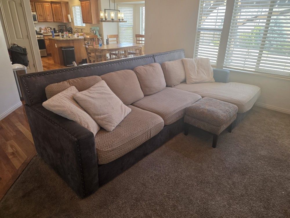 Upgrading our living room and selling this comfortable, modern L-shaped sectional. This sofa features a dark charcoal/espresso base with elegant silver nailhead detailing along the back and arms. Condition & Details: Color: Dark base with light oatmeal/beige cushions. Comfort: Deep seating, perfect for lounging or hosting. Bonus: Includes a full set of custom-fit textured covers (shown in photos) that protect the cushions and give the couch a different look. Condition: The cushions do have wear and tear. I included some of it in the imagery but it is hidden when the cushion is in place or when using the included covers. Otherwise, the frame and foam are in great shape. Must be able to pick up; will likely require two people and a truck/large van.
