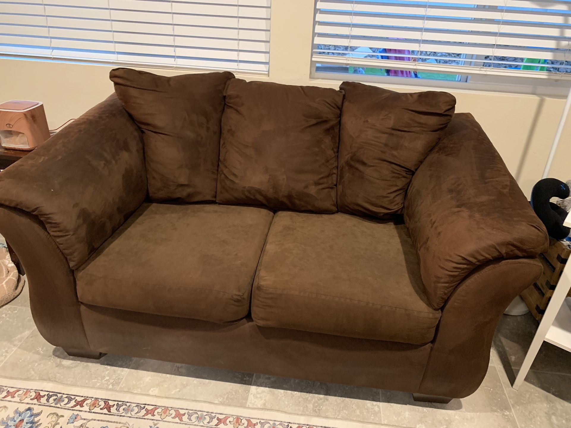 Chocolate Brown, love seat and sofa. Cushion seat covers removable washable, back cushions attached . No rips or tears. Used and loved over the last few years.