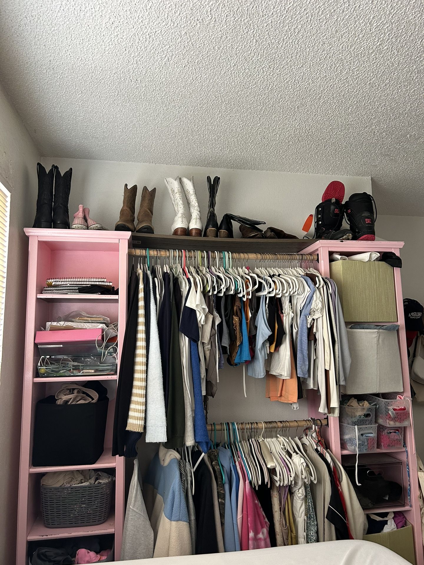 Selling my “closet”, or can be used as separate shelving. My current apartment did not have a closet , so we made our own using there’s two large column shelves and clothing racks on top and bottom. Stores a lot of clothes and can put stuff on top as well. Limited to Santa Barbara/Goleta area!