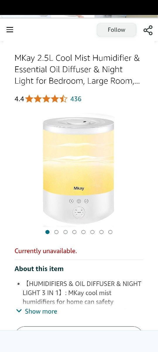 MKay 2.5L Cool Mist Humidifier & Essential Oil Diffuser & Night Light for Bedroom, Large Room, Baby Nursery, 28dB Quiet, Auto Shut Off, 12-30H Run Time, White, Ultrasonic, Touch Control No box like new