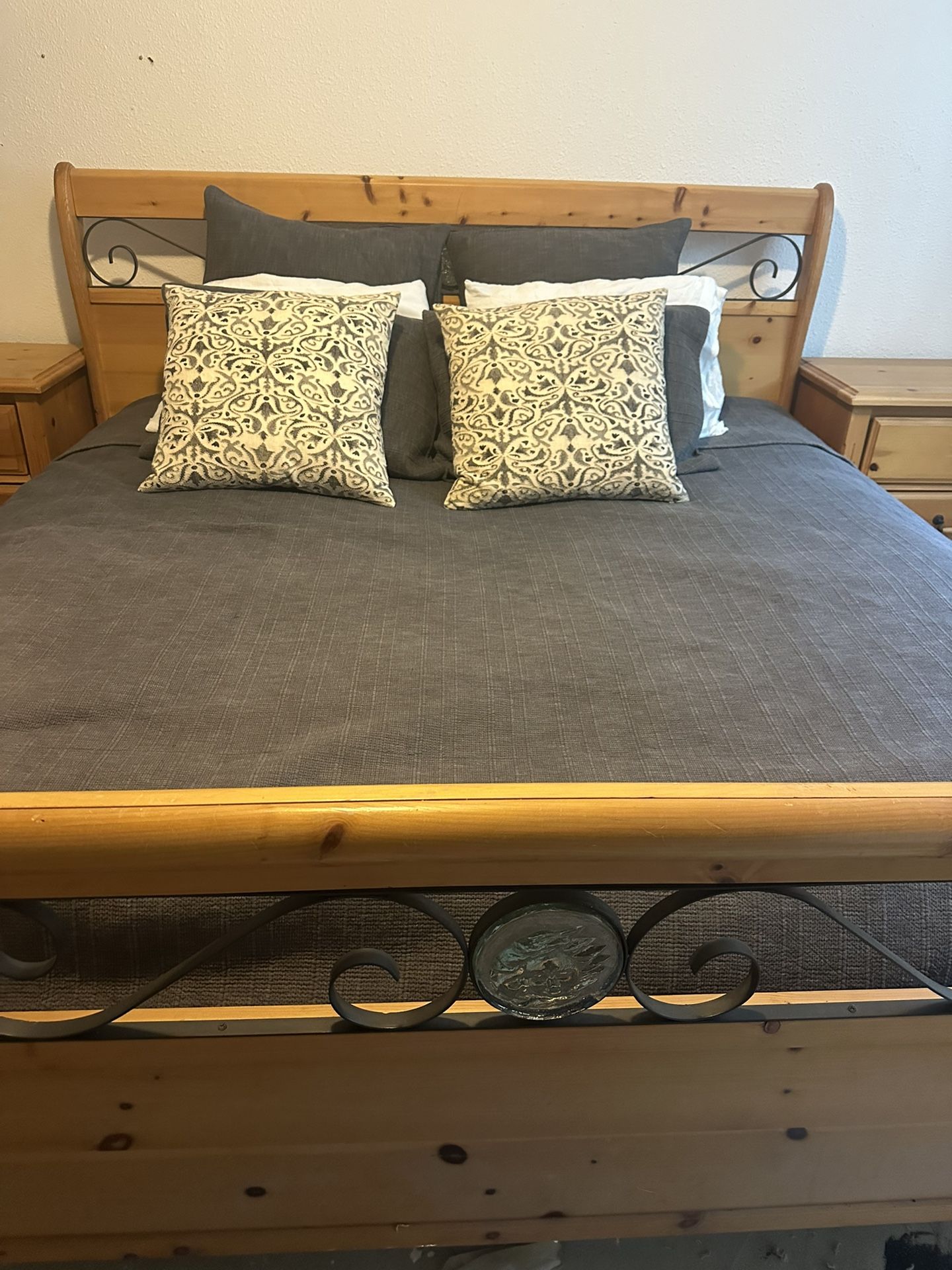 King size bed, frame, and mattress with box springs Dresser with 9 drawers 42T 31W 18D drawers all work perfectly 2 nightstands 33T 31W 18D