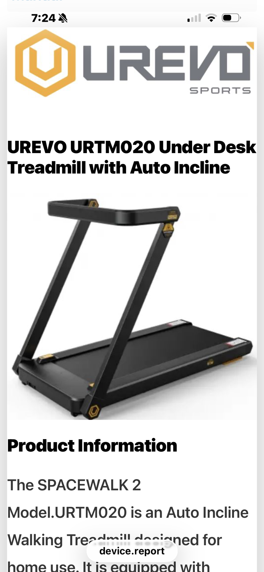 Compact UREVO SPACEWALK 2 Model URTMO20 is an auto incline walking treadmill. Designed for home use. It has various features to enhance your walking workout experience. Treadmill comes with a remote control for easy operation and a CR2032 3V battery for power. Selling as is. Open box but new. You can look at it before you buy. Box has seen better days but treadmill is in excellent working condition. Comes with treadmill oil.