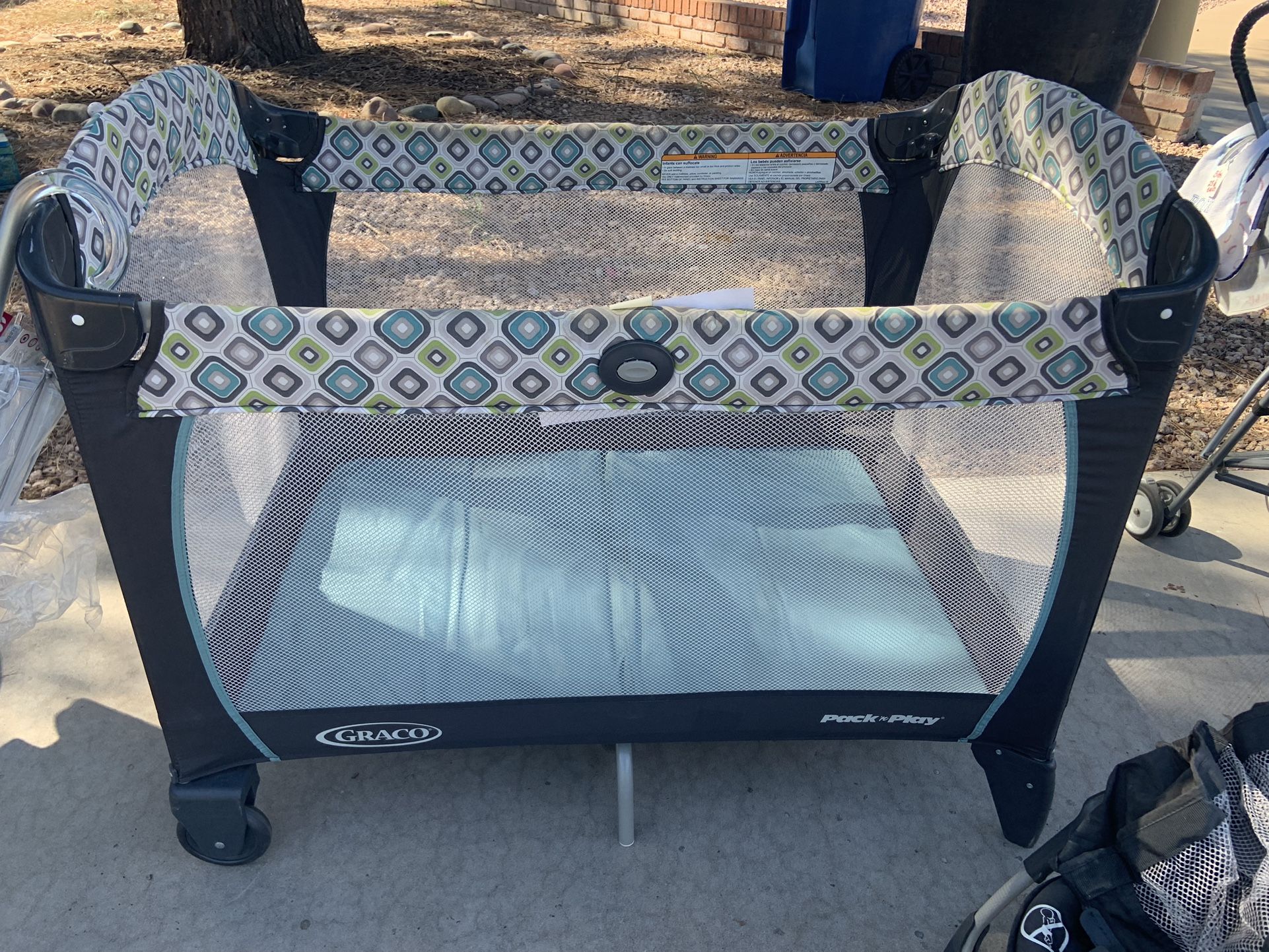 Pack and play - Graco affinia pattern. Includes bassinet/changing table insert and diaper caddy bag that attaches to side. Grows with baby! Pickup in Mesa
