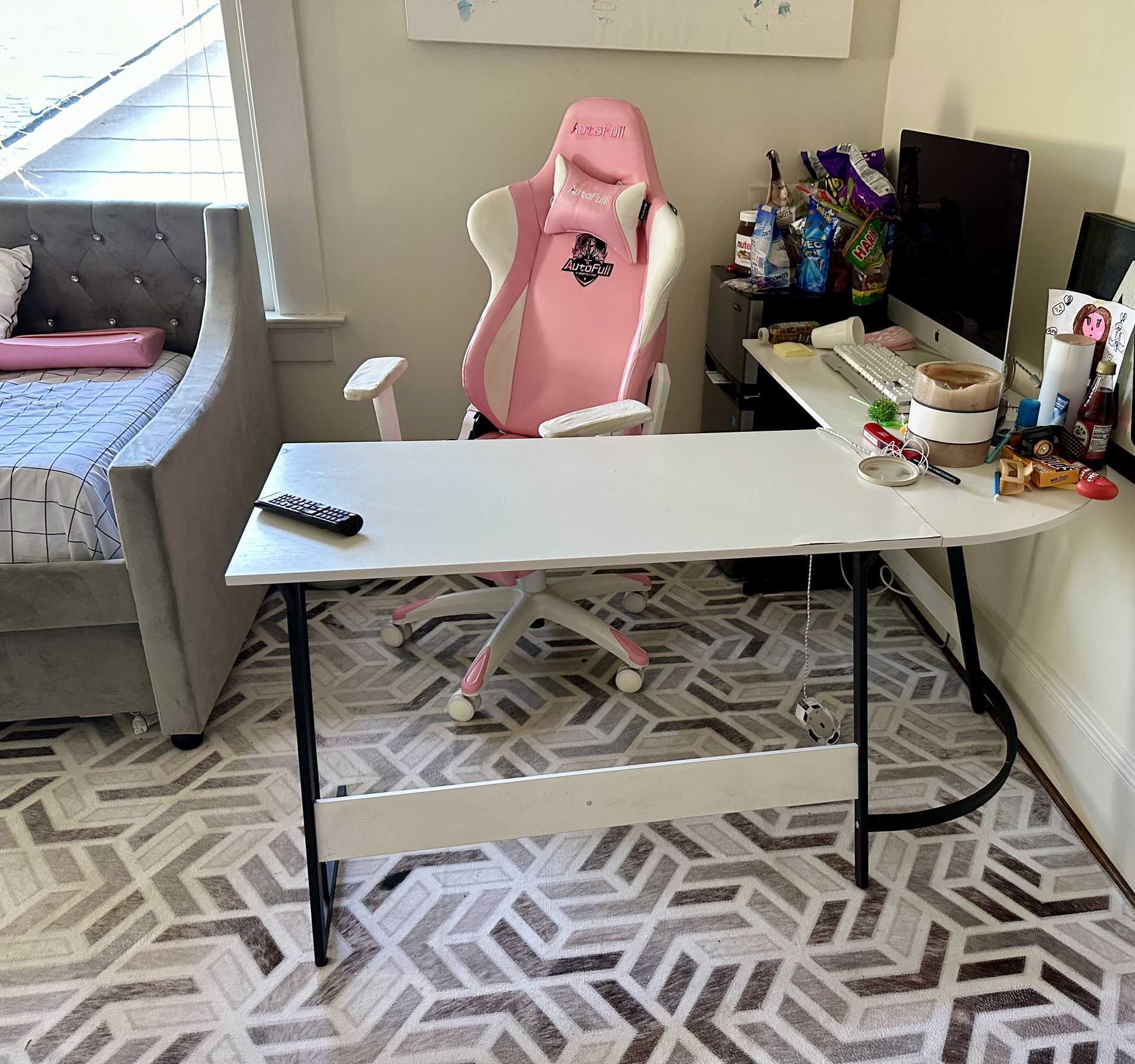 Our daughter has a new desk and so we’re getting rid of this one. It’s in decent condition but has a few dings. It has enough space for her to spread out and that’s what she liked about it to do homework, but have another area for her computer, etc..