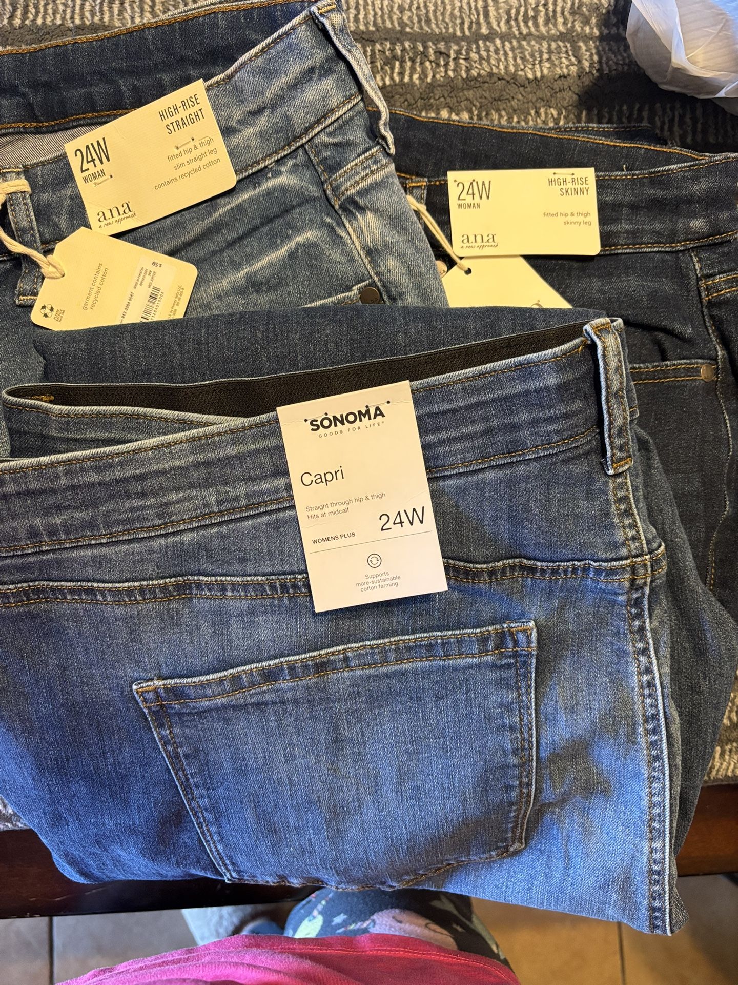 All 3 are brand new with tags lost the weight too fast to even wear them 1- high rise skinny jean (dark blue) 1- high rise straight jean (wash) paid $59 ea 1- capri paid $50 Asking $30 each or $80 for all 3 Please no long holds
