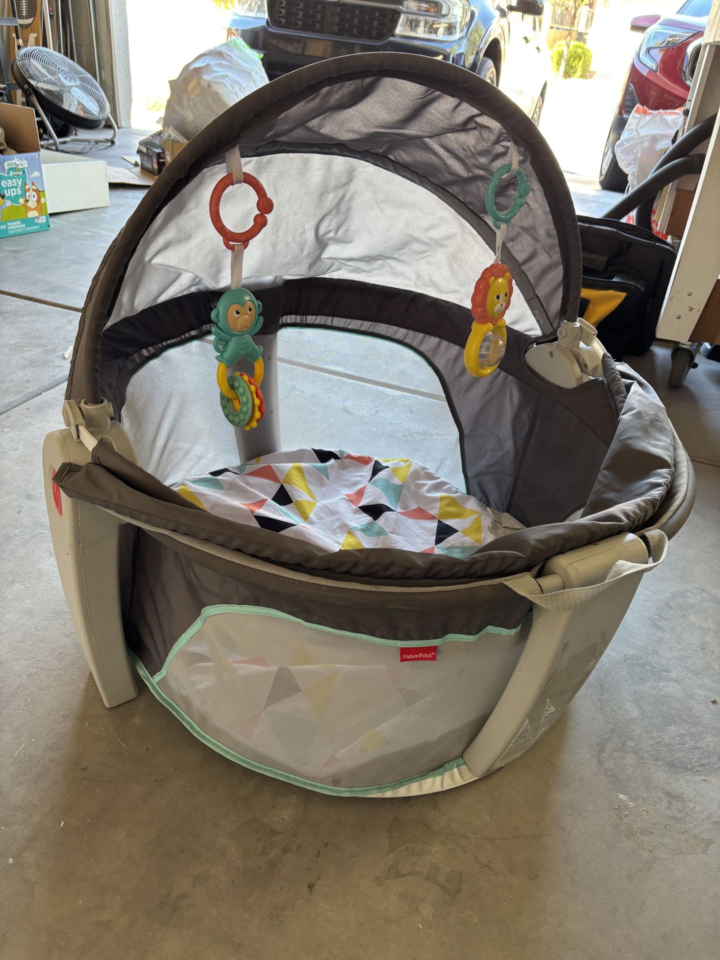 Still in great shape. Has mat and dangling toys. Folds flat. Great for traveling. Comes with bag of balls. We used it as a ball pit once our little ones hit the toddler stage. They loved it. $25 obo Cheyenne and 215 Cash please.