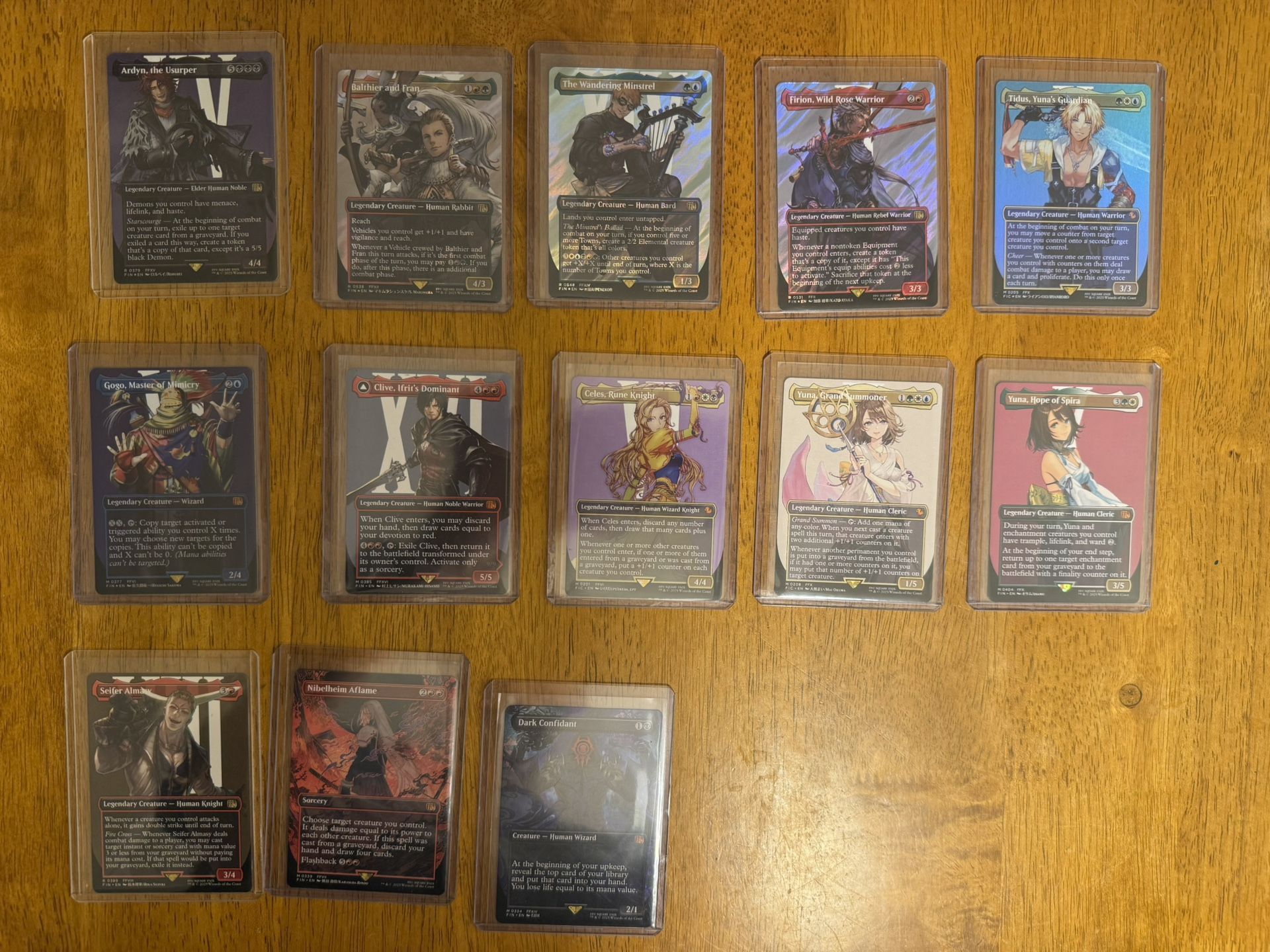 Looking to sell or trade for a “Agadeems Awakening,” “ borderless foil “cloud, ex soldier” or other Final Fantasy cards. I have many not listed so feel free to message me. Tidus, Yuna’s Guardian - borderless foil Firion, Wild Rose Warrior- borderless surge foil The Wandering Minstrel- borderless surge foil Balthier and Fran- Borderless surge foil Ardyn the usurper - borderless foil Gogo, master of mimicry - borderless foil Clive, ifrits dominant- borderless Celes, Rune knight - borderless Yuna, Grand summoner - borderless Yuna, hope of spira - borderless Seifer- borderless Nibelheim aflame- borderless Dark confidant- extended art Cecil, Dark Knight - Borderless Surge foil Exdeath, Void Warlock - extended art foil Bartz and Boko - extended art foil Buster sword - foil Gogo, Master of mimicry - borderless Emet- Selch, Unsundered - Borderless Yuna, Hope of spira - nonfoil