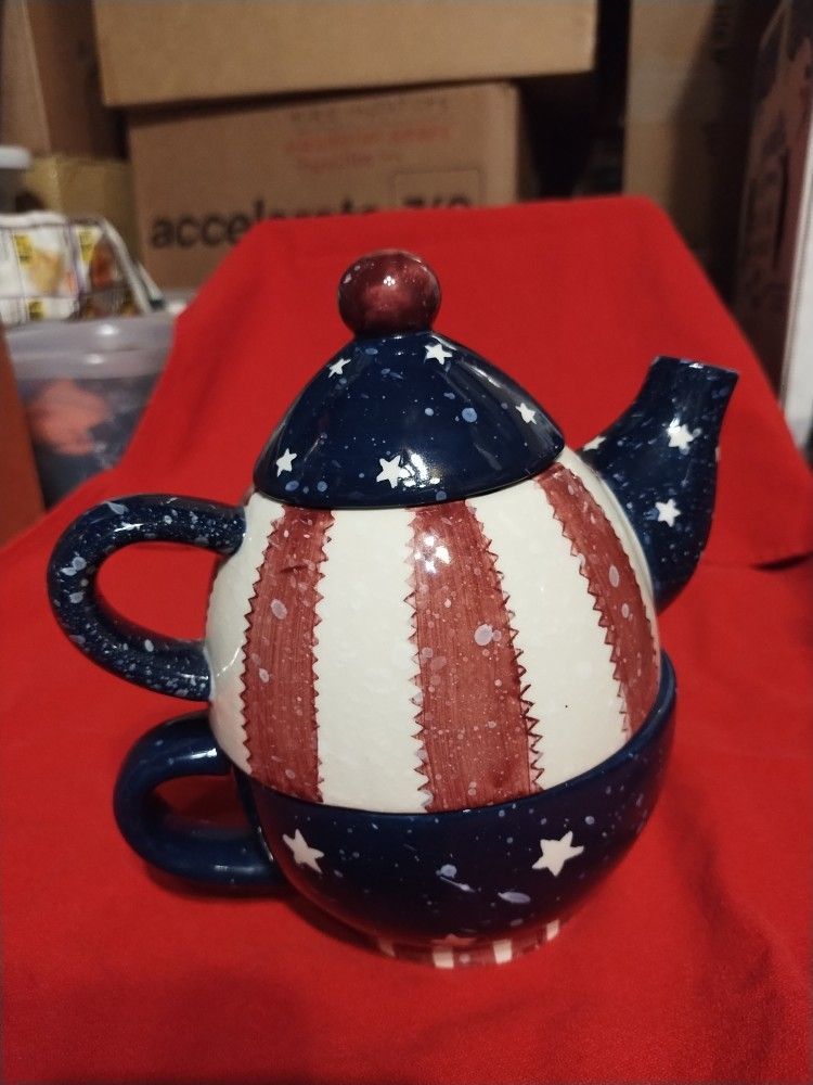 American flag decoration on tea pot with a cup adapted making one piece