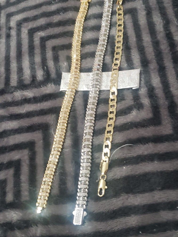 3 brand new beautiful gold plated bracelets. NOT REAL GOLD!!!! 25.oo each the blinged out ones 9in long . For man or maybe girls ankle. The non bling 8in. NO TRADES OR SHIPPING.