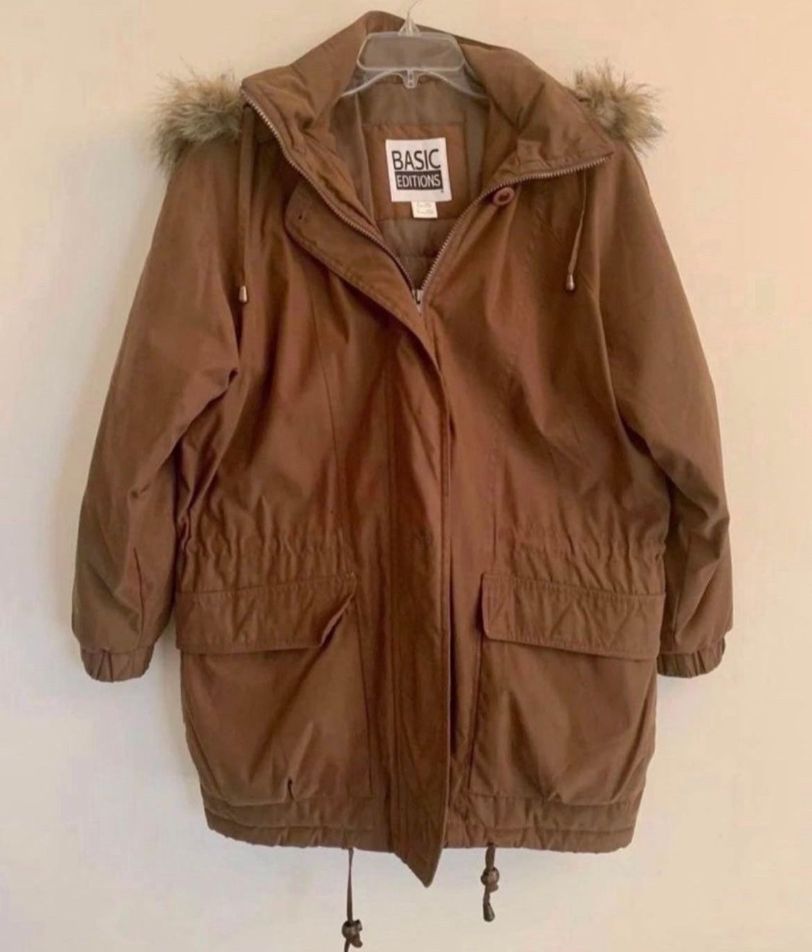 Nice & super warm, brown parka with detachable faux fur-trimmed hood made by Basic Editions. - Ladies size small - Zipper closure - Double pockets have top flap opening with side pocket - Waist can be cinched or let out for a looser fit - Made of 100% polyester - In great condition - From a smoke-free home