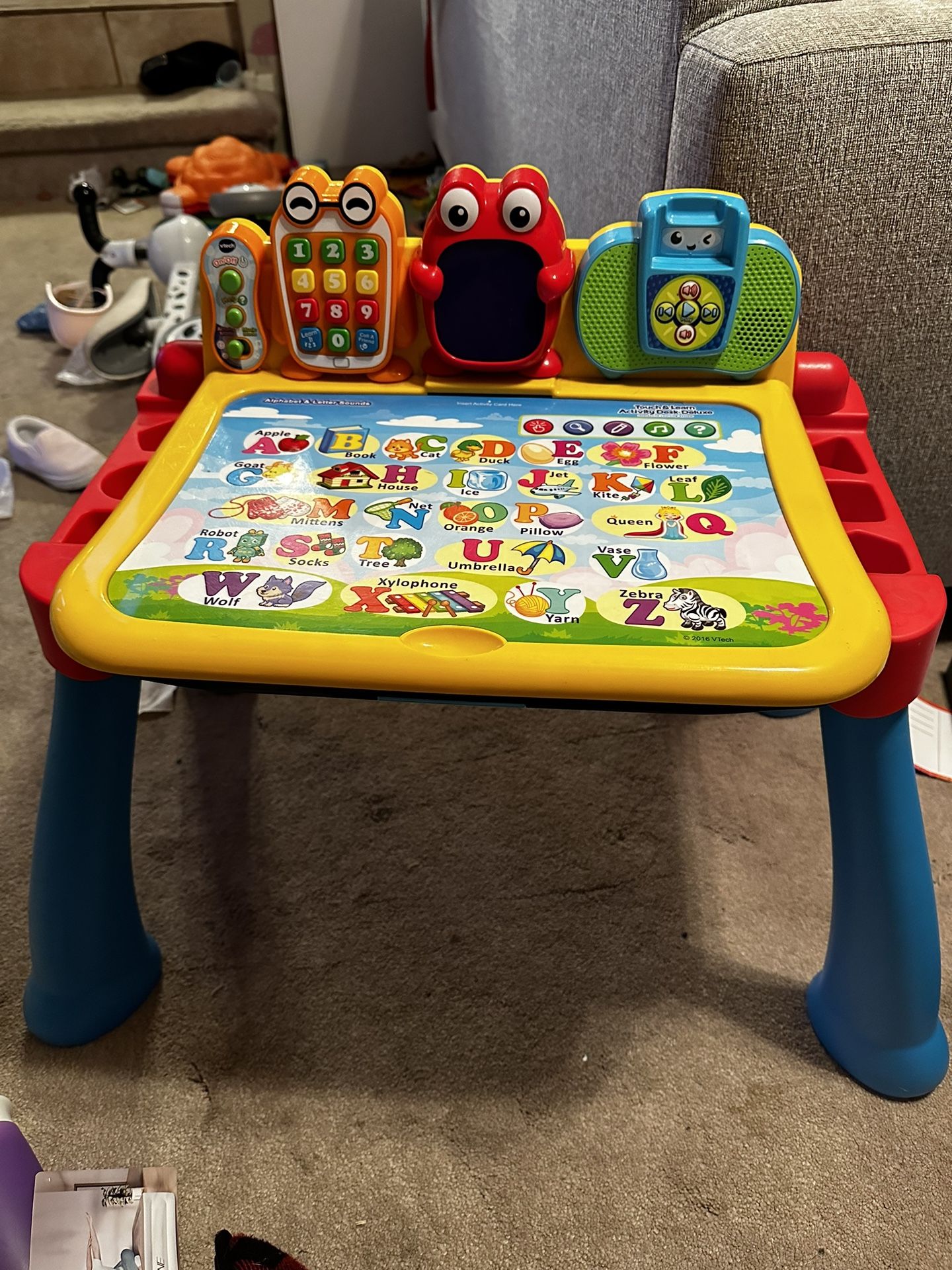 Gently used table. Comes with the stool. Works perfectly child just outgrew it. Has an extra activity mat. It was wiped down but could probably just use another wipe down in certain areas. Pickup only.