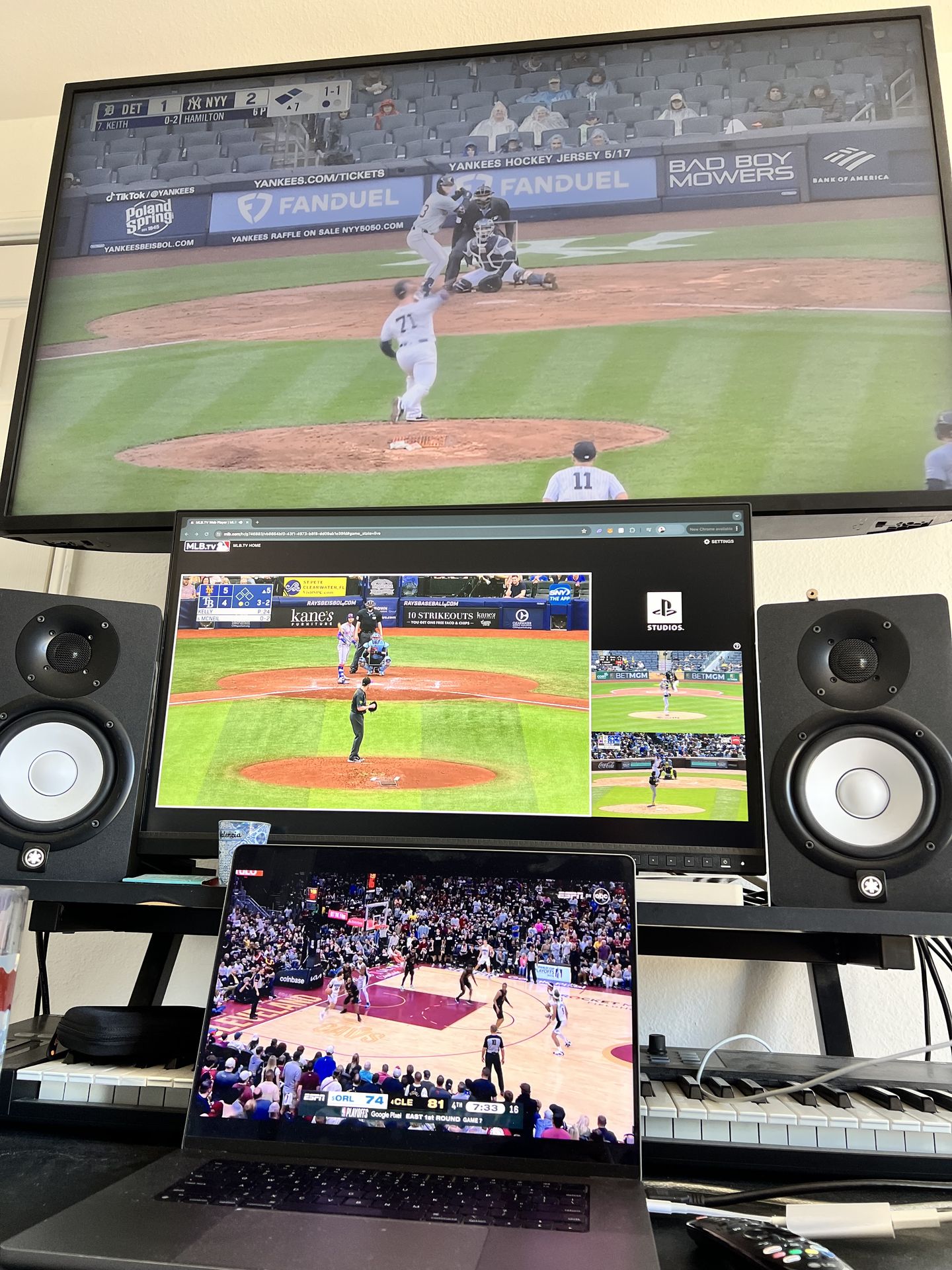 The top TV pictured in the first two photos. We don't need it anymore as we already have one TV. It is otherwise in great condition! 52" LG smart TV with Disney+, Hulu, Max, chromecast, and apple play. The wall mount is flexible and allows the tv to easily come in and out from the wall. $200 for both the mount and smart TV with screws that fit and you can drill in wall!