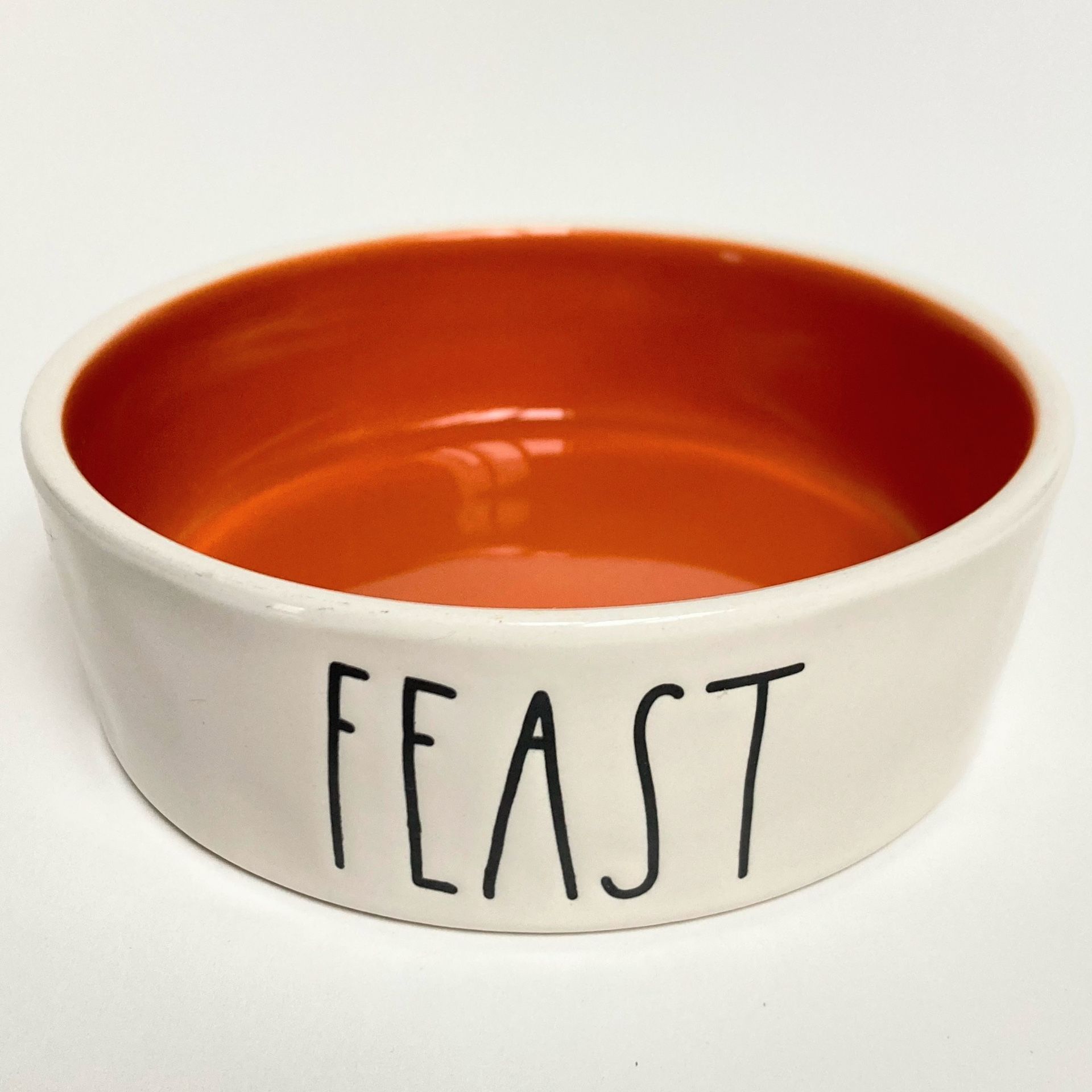 Rae Dunn Small “FEAST” Pet Food Bowl The orange is a bit lighter than pictured. Diameter: 4.75” Height: 1.5”
