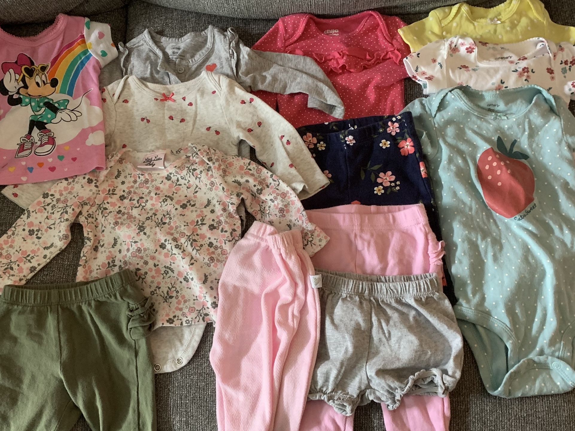 All basically brand new, worn maybe once. Nothing pictured is stained, all freshly washed. The few things that are 9m fit more like 6m I found.