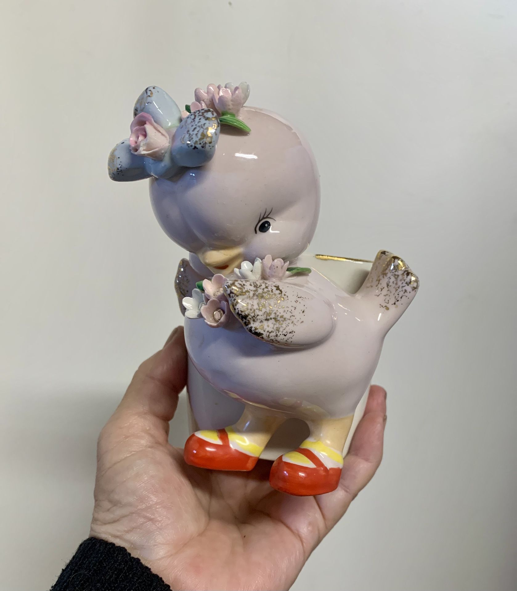VINTAGE LEFTON PINK CHICKEN WALL POCKET PLANTER-RHINESTONES & RED SHOES-EASTER