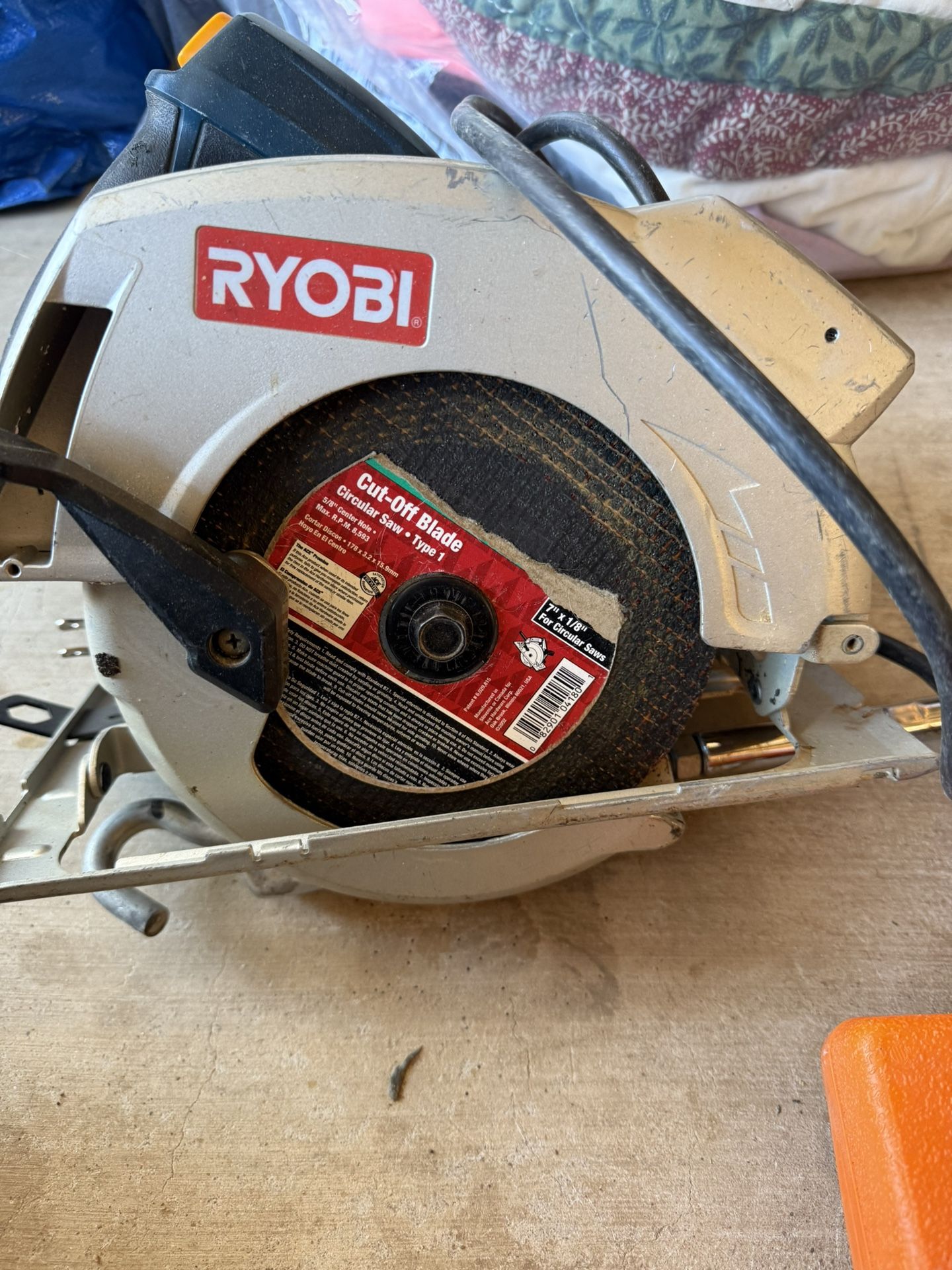 Ryobi 7-1/4” corded circular saw in good working condition. Strong motor, adjustable depth, and includes the cut-off blade installed. Ready for any job.