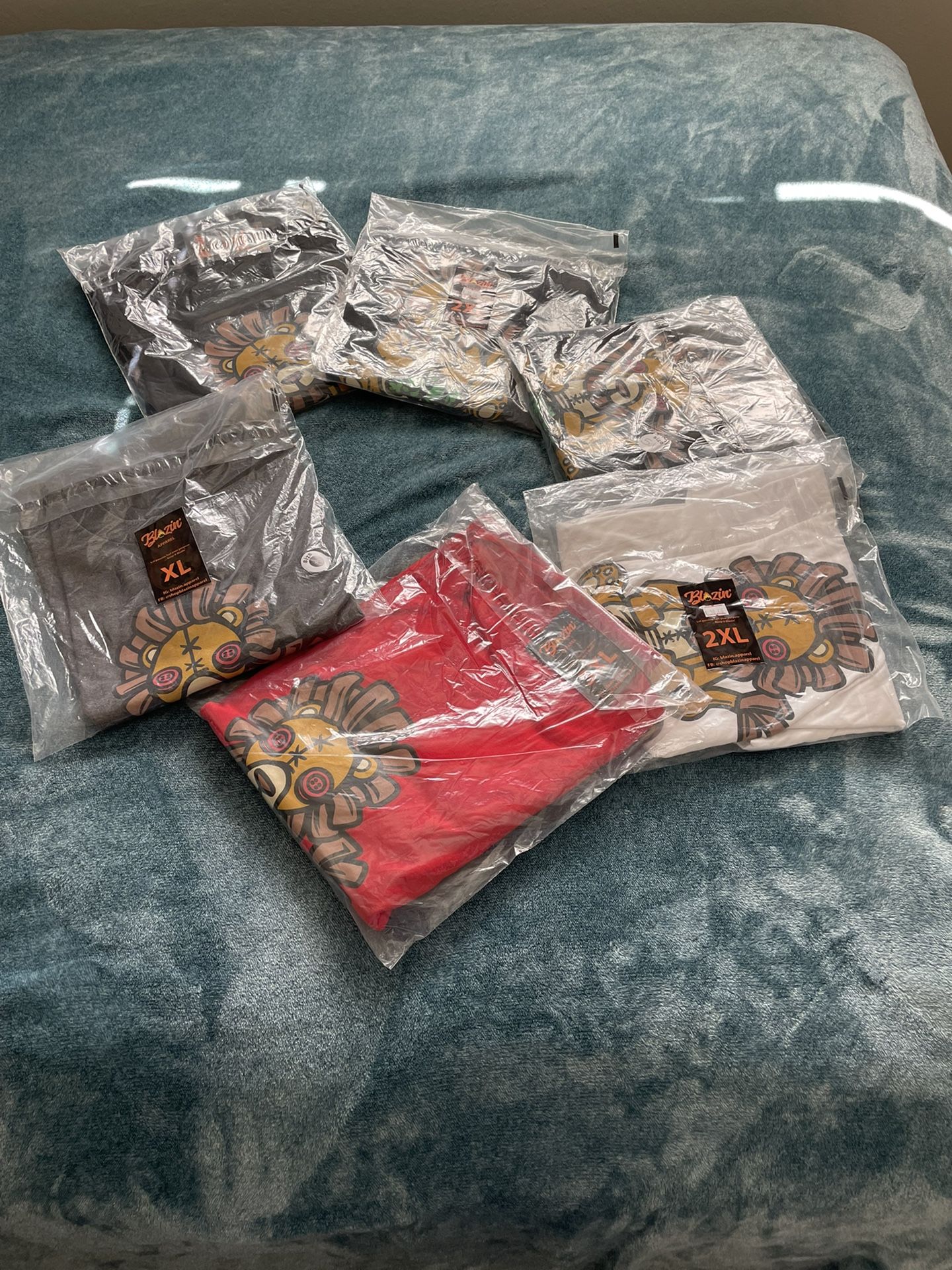 Let me know what size you wear so we can get you fitted. Shirts-shorts $25 Hoodies $60 Red Blazin shorts 1 xl, 2 2x Black 1 2x Grey 1 2x Blazin shirts Black 3x, 5X Grey xl Red 3xl White 2xl Blazin red hoodies 4x Medium Large
