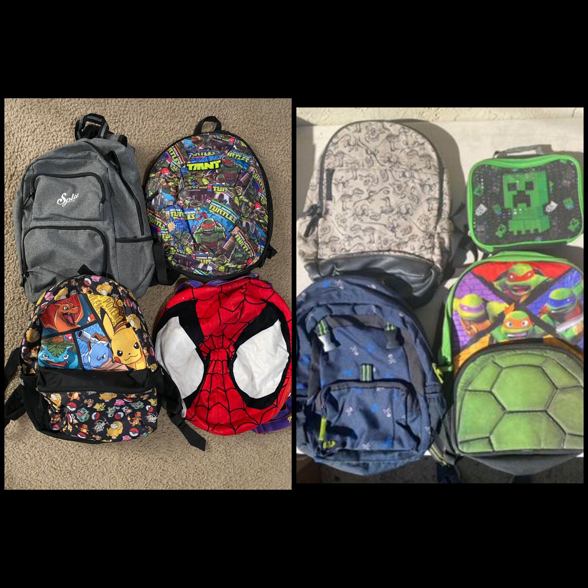 TMNT shell backpack $10 Split backpack $10 Pokémon backpack $10 Spider-Man backpack $5 Minecraft lunch box $3 TMNT backpack $5 Skull backpack $3 Dinosaur backpack $5